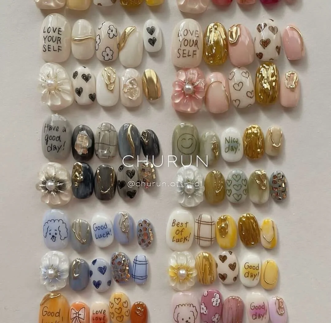 churunでは、様々な種類のデザインを お取り扱いしております🌼✨ その日の気分に合わせてネイルチップとの コーディネートも楽しんで頂けます🌸🩵 ネイルのデザインに入っている文字は ポジティブな意味のものばかりで、 皆様がもっとハッピーになれるように.. という思いを込めて描いております✍🏻🎀 POPUP商品は全て一点ものとなっておりますので、 是非、自分だけのお気に入りのデザインを見つけてください🐶🤍 ネイルチップは何度もご使用可能になっており 特別な日にはもちろん、デイリー使いもして頂けます🥂