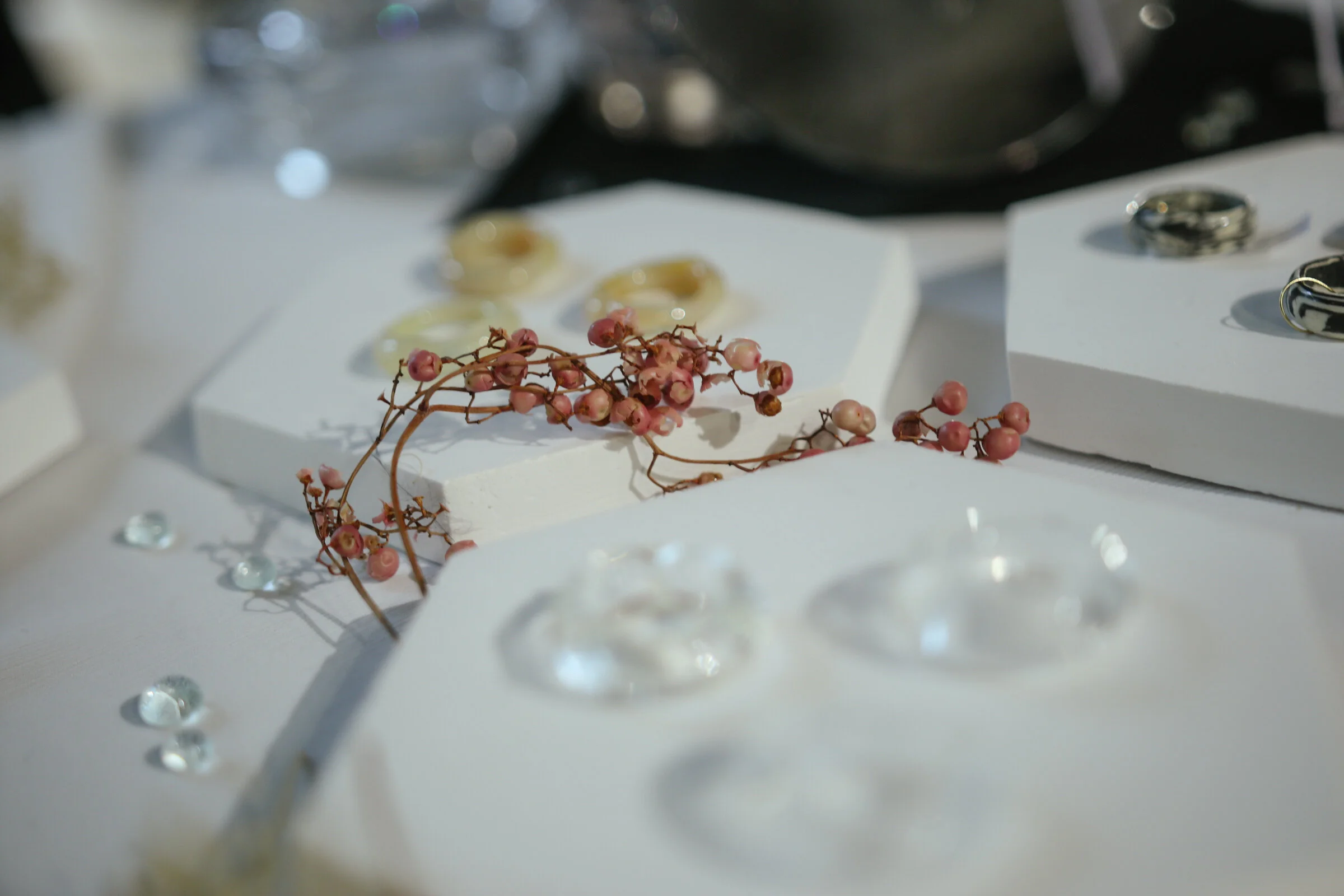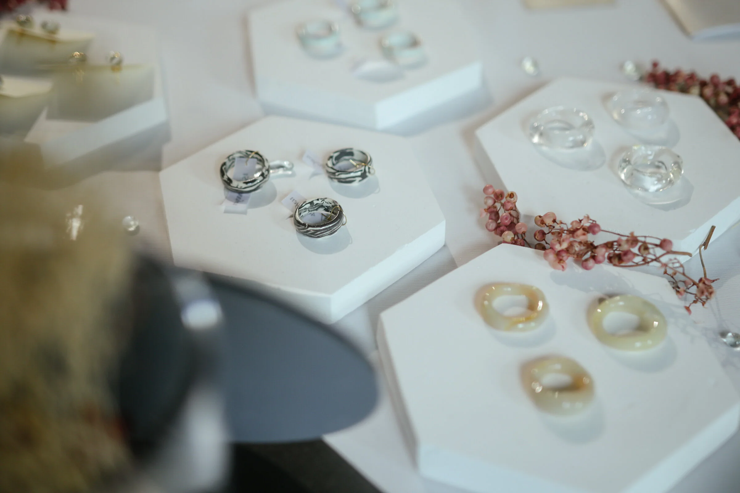 ライフスタイルからは、ウエディングやオーナメントにぴったりなPetal and Airさんのフラワーアイテムと生活の中にぬくもりを届けてくれる椎猫白魚さんの陶器。アートからは、前田豆コさんによるちょっぴり不思議で奇抜な彼女の世界観溢れるイラスト。そして最後に、ファッションからはジュエリーブランドfogliaさんによる1000度の炎で溶かして作られるガラスで作られたリングたち。