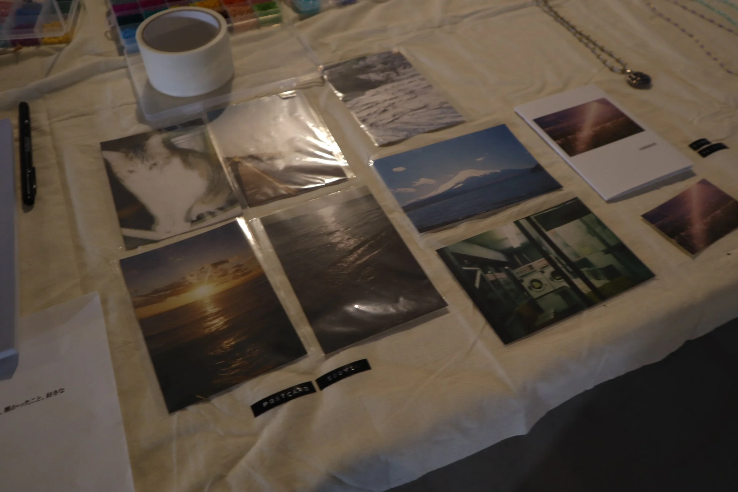 hitrchikaさんは1Fでの写真の展示に加え、B1でフォトカードとハンドメイドのネックレスを販売しました。フィルムカメラで映し出された暖かな色味の写真。手に取って見ていると、写真の向こう側にある自然に癒されたり、フォトブックの中にあるhitrchikaさんの世界にお邪魔したような気分になり、不思議と心が暖かくなりました。