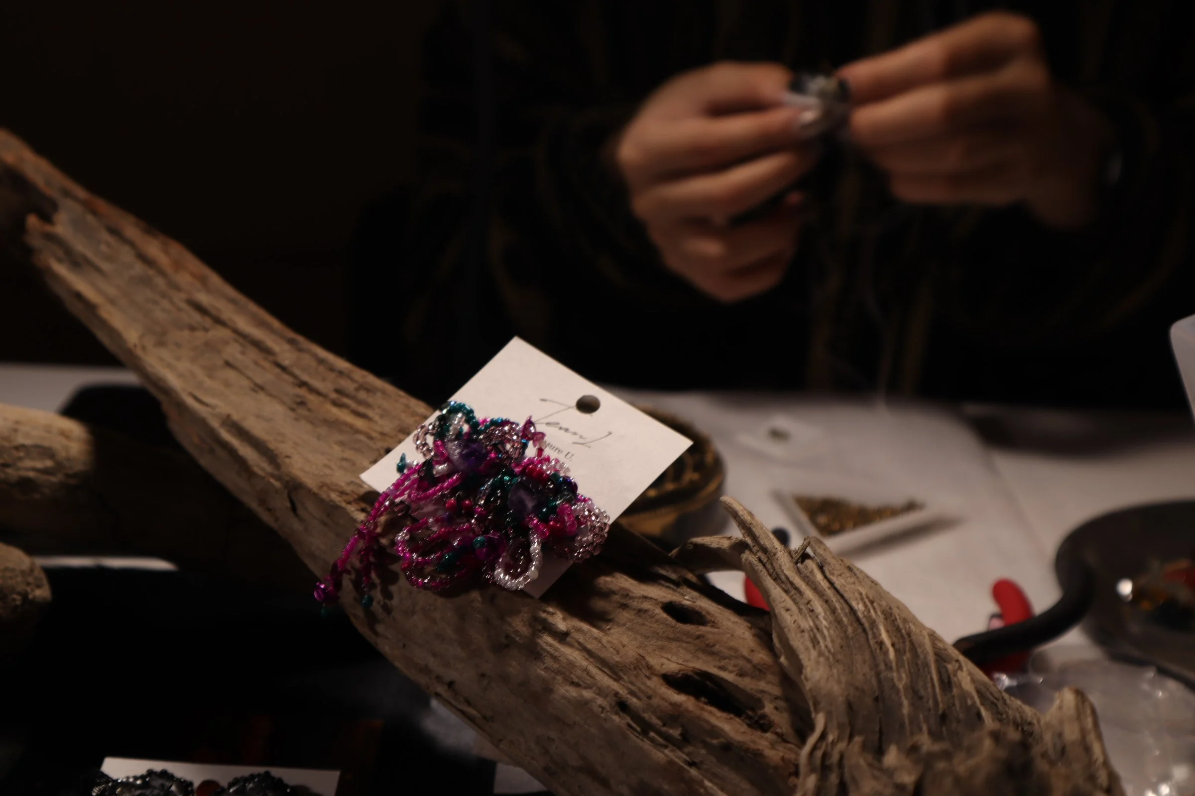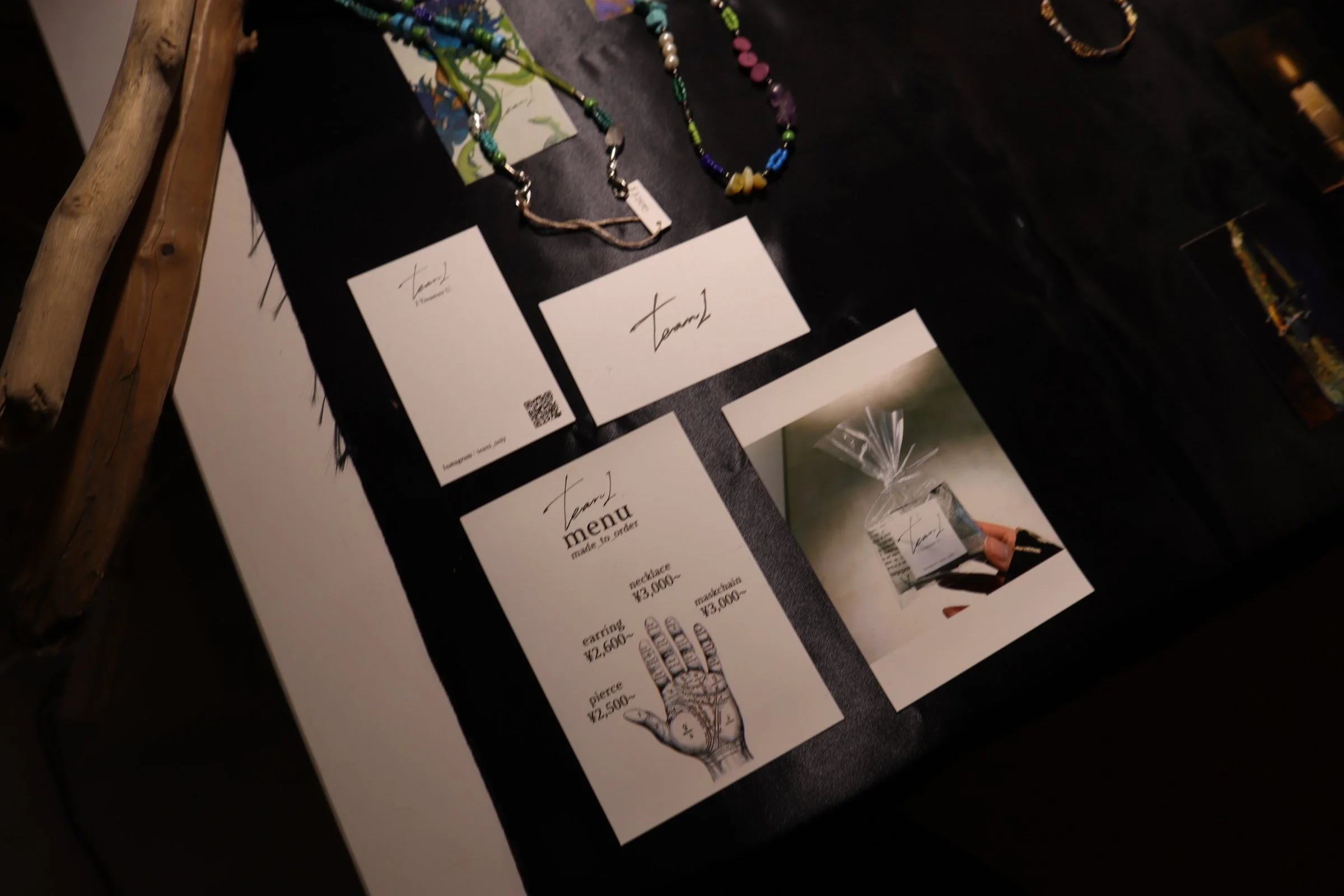 teanIさんのテーブルには、繊細に作られたまるで宝石のような、ピアス・イアリング・ブレスレット・ネックレス・マスクチェーン・眼鏡チェーンが敷き詰められていました。販売と同時にその場でアクセサリーの制作もされていて、アクセサリーを構成する、彩どりでサイズもバラバラなビーズや石といった素材も見ることができ、アトリエに来た気分になりました。