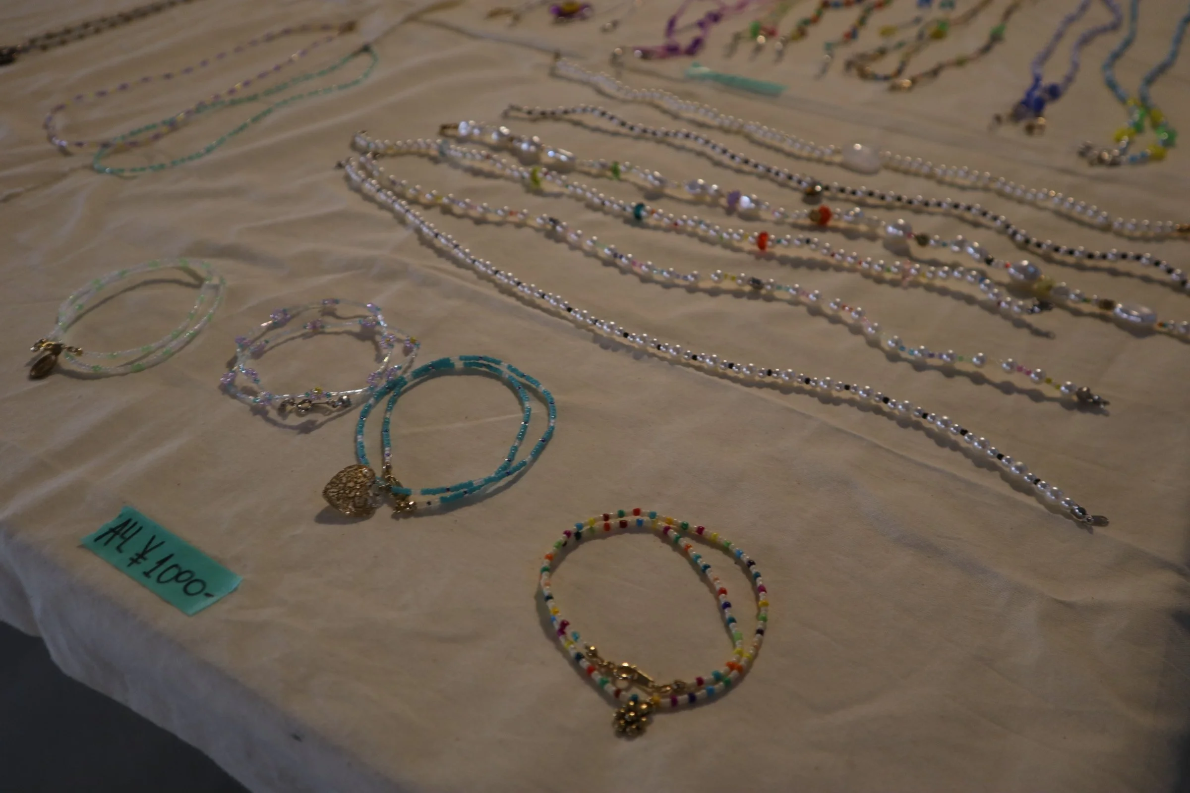 by your sideさんは、ビーズとパールからネックレスを作っています。付けるといつもより気分が高まりそうなカラフルでポップなアクセサリーが並んでいました。