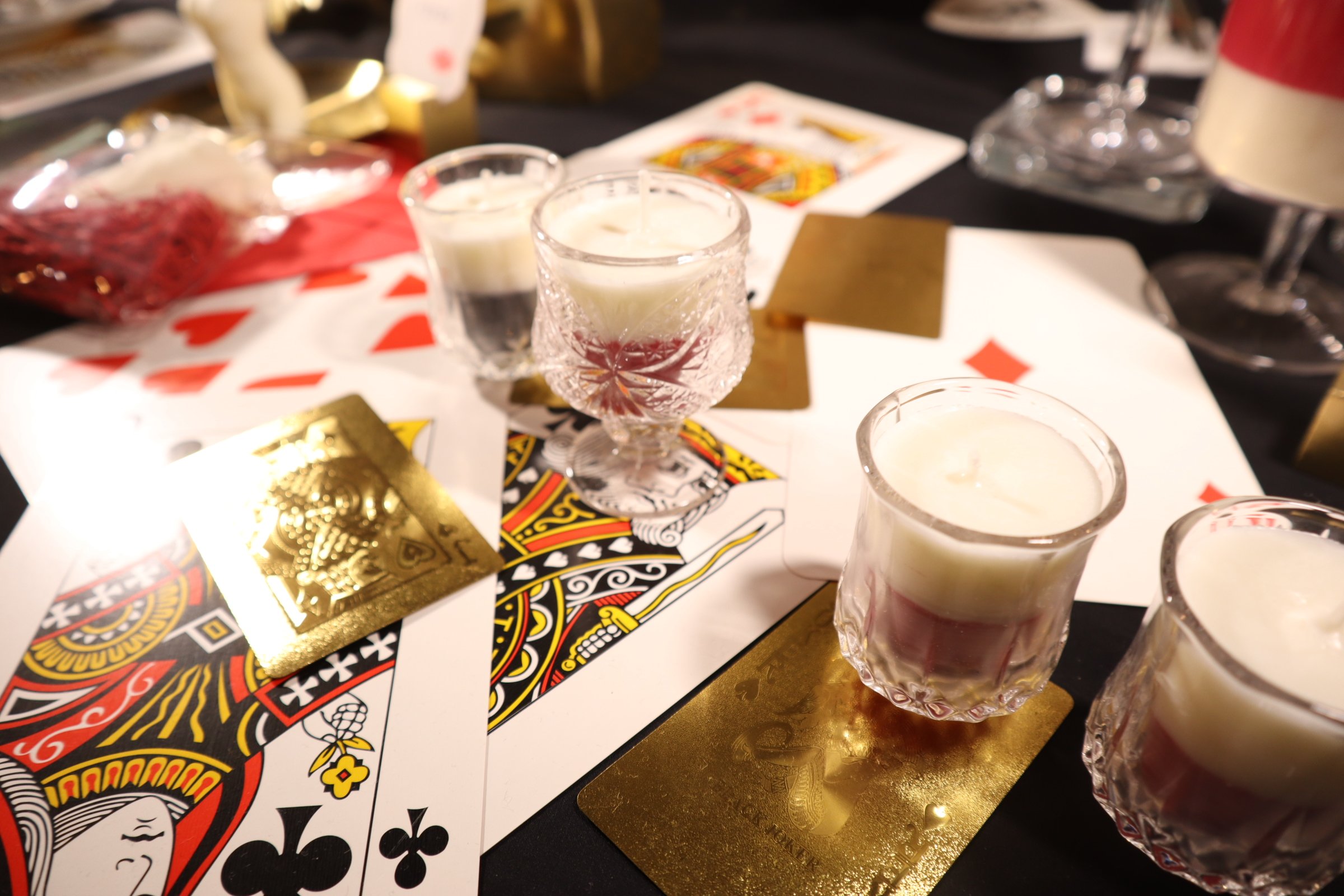 KAMEIさんのキャンドルショップ。色鮮やかな展示に目を引かれます。大小様々なキャンドルは、トランプや唇がモチーフとなっていて、散りばめられたステッカーやトランプ、額縁に入ったイラストなどの装飾一つ一つにも心ひかれました。