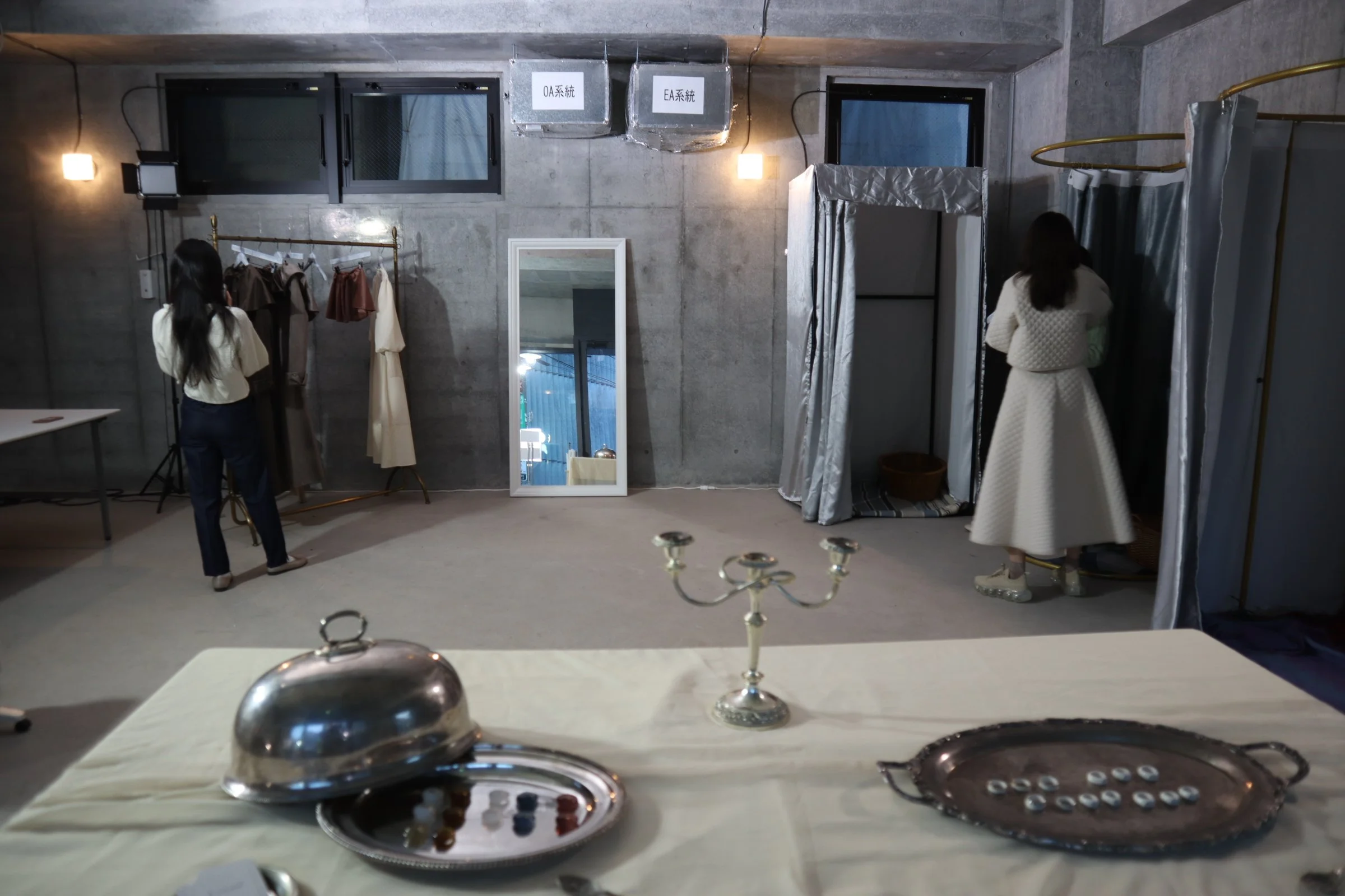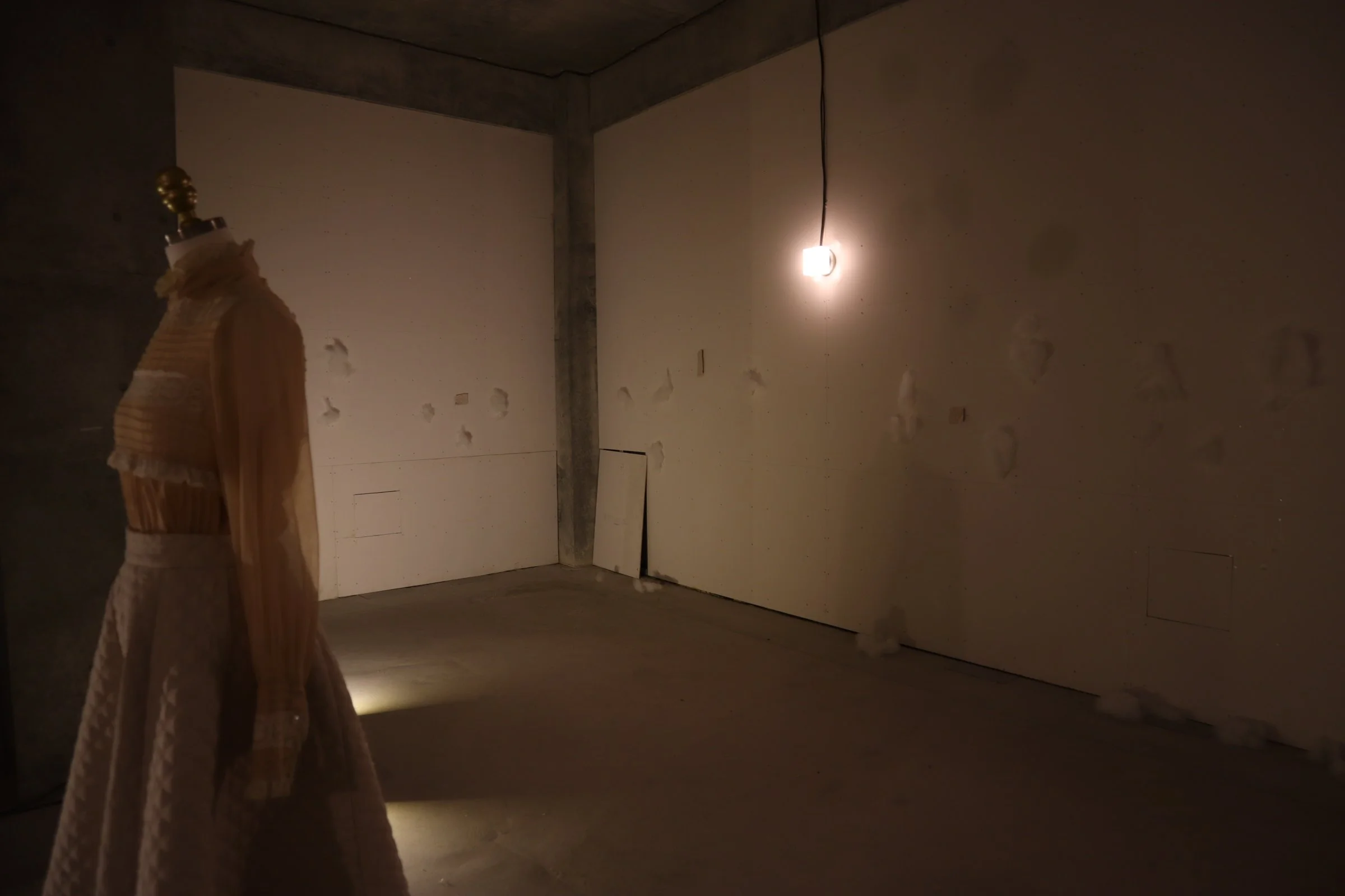 1Fの雰囲気とは打って変わって、地下では暗いトーンの照明の中でインスタレーションが展開されていました。今回1Fでお披露目された服は、モスクのタイルの壁から着想を得ていることから、壁から綿が沸いている様子をモチーフにした空間が作られました。