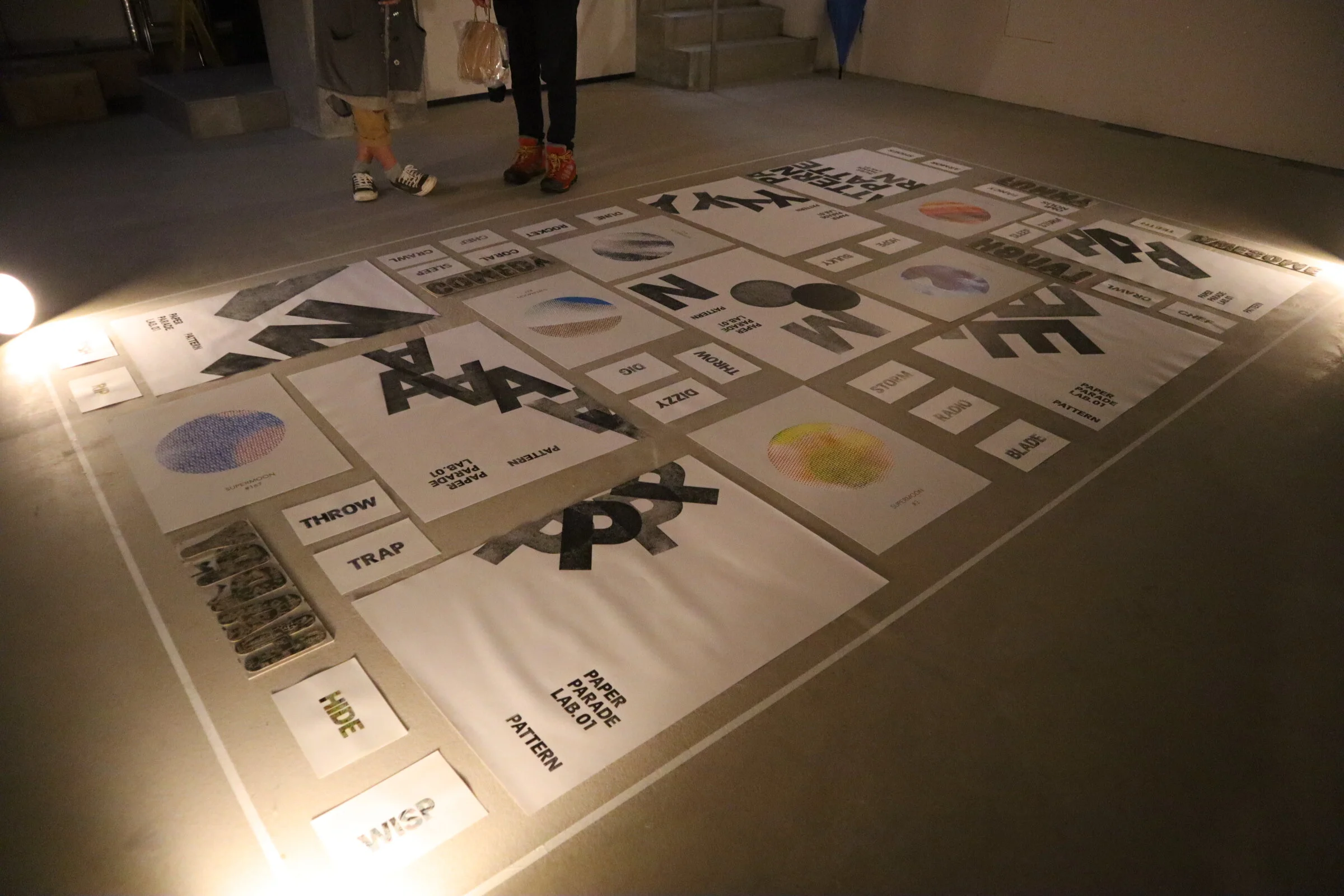 B1FではPaper Paradeの2名のクリエイターによる展示「Paper Parade(網点とベタの印刷実験)」が4日間に渡って開催されました。床一面に文字や幾何学模様が敷き詰められていて、目を奪われます。