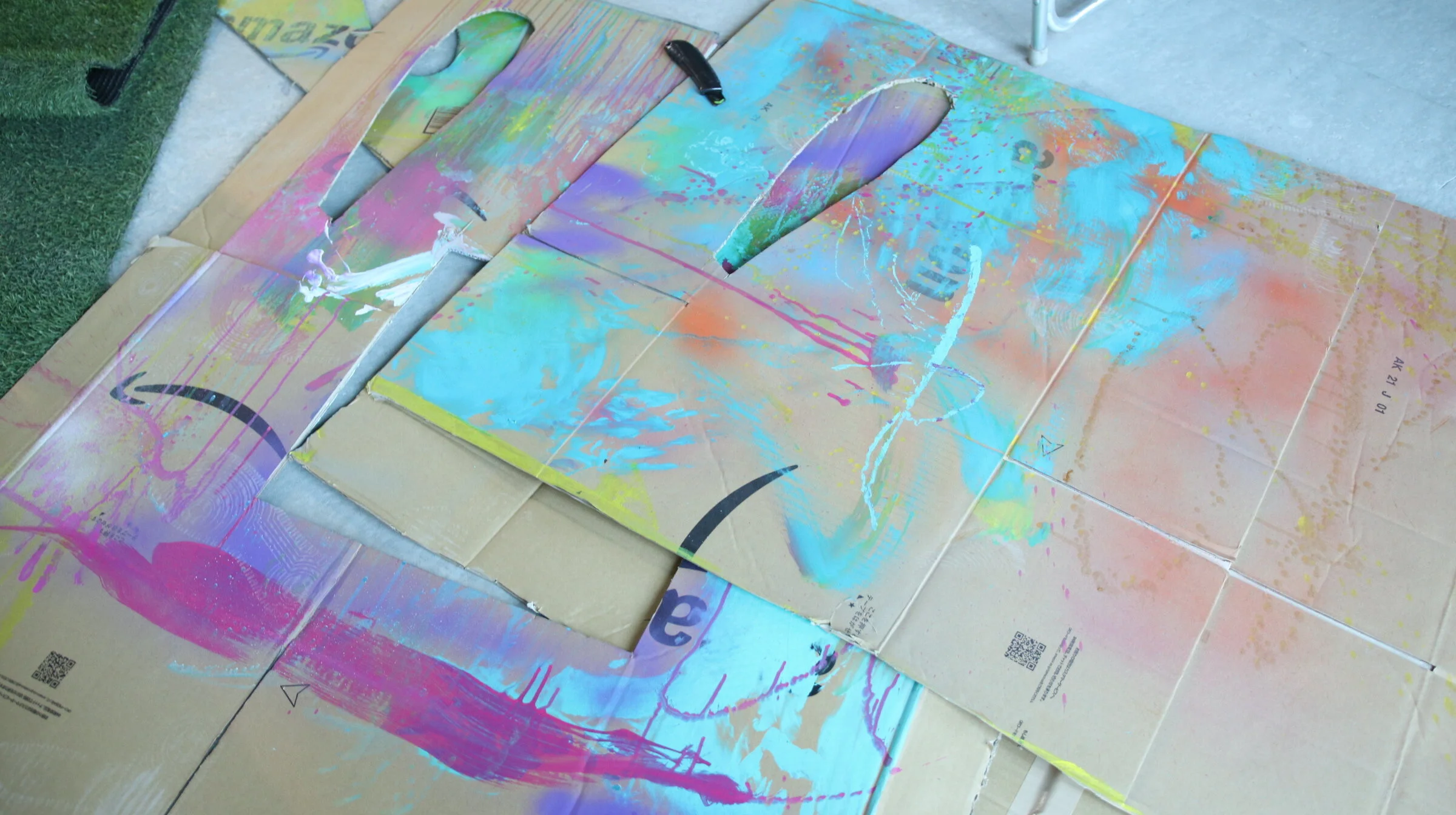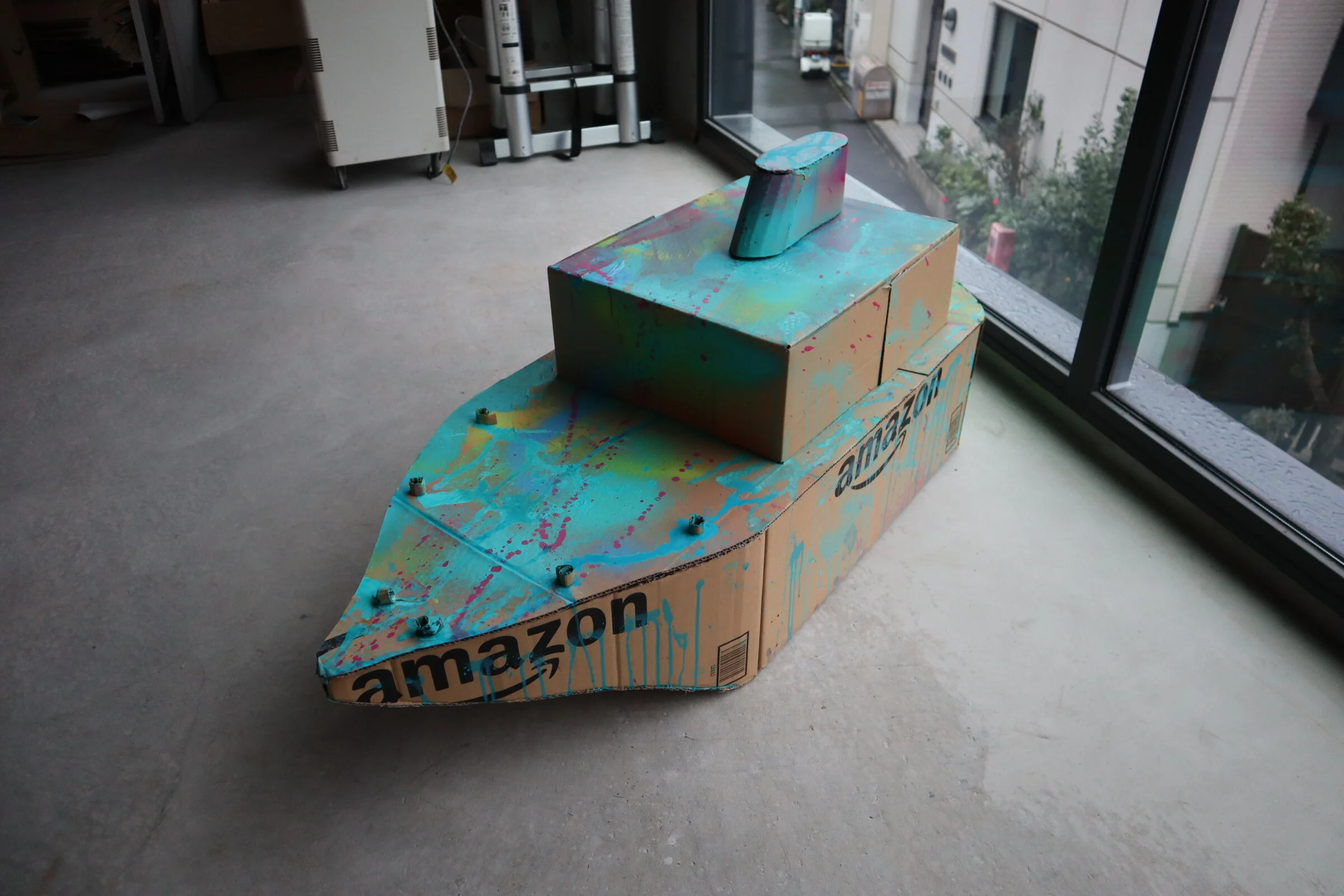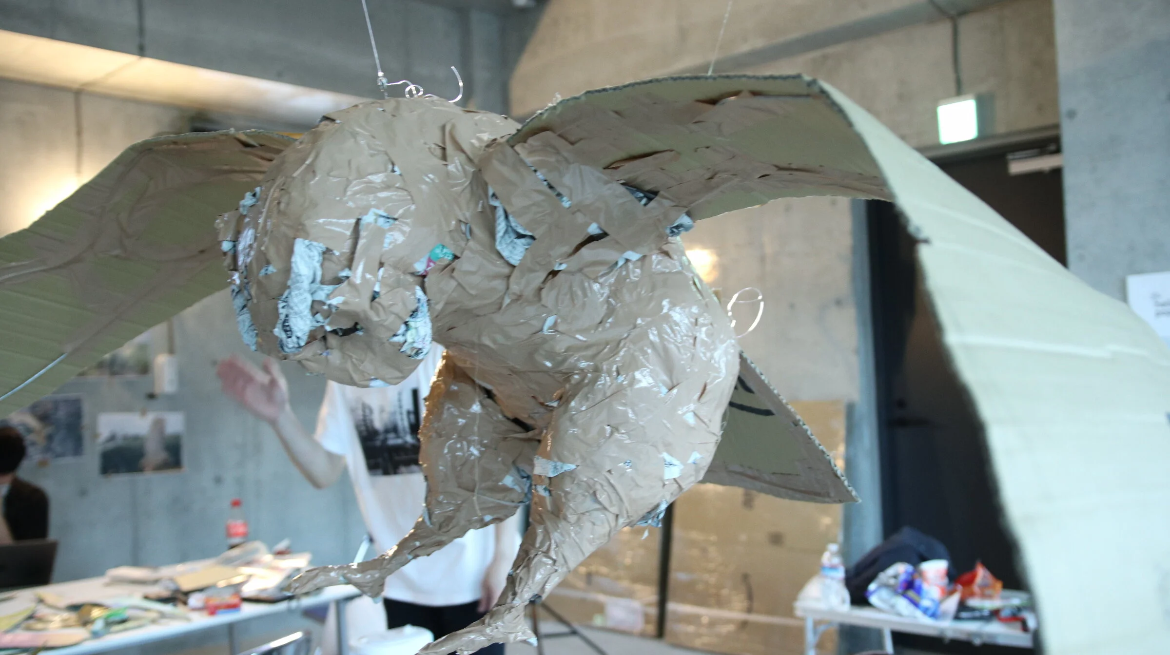2日間の展示の前には、同会場にて作品の制作もされていました。当初はペイントされたダンボールが積み重なり、作品の原型が作られ始めていた制作現場でしたが、数日後完成したものを見て、段ボールから作り上げられたその仕上がりに驚かされました。