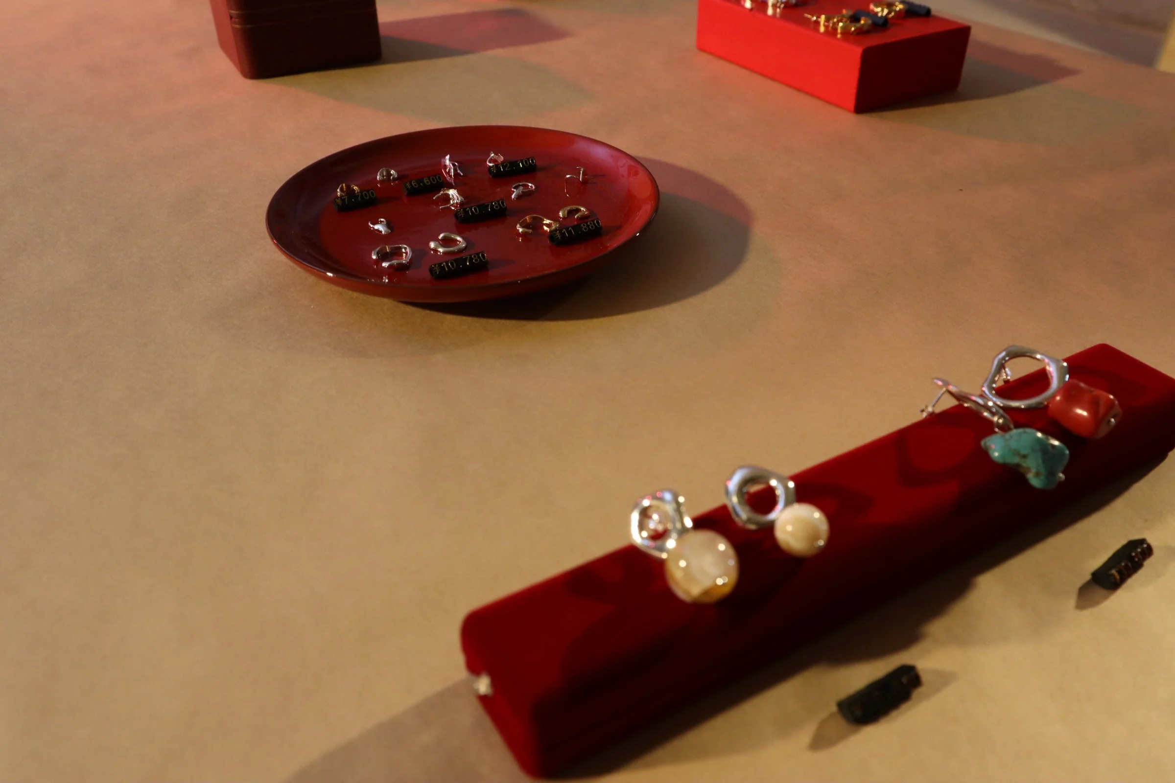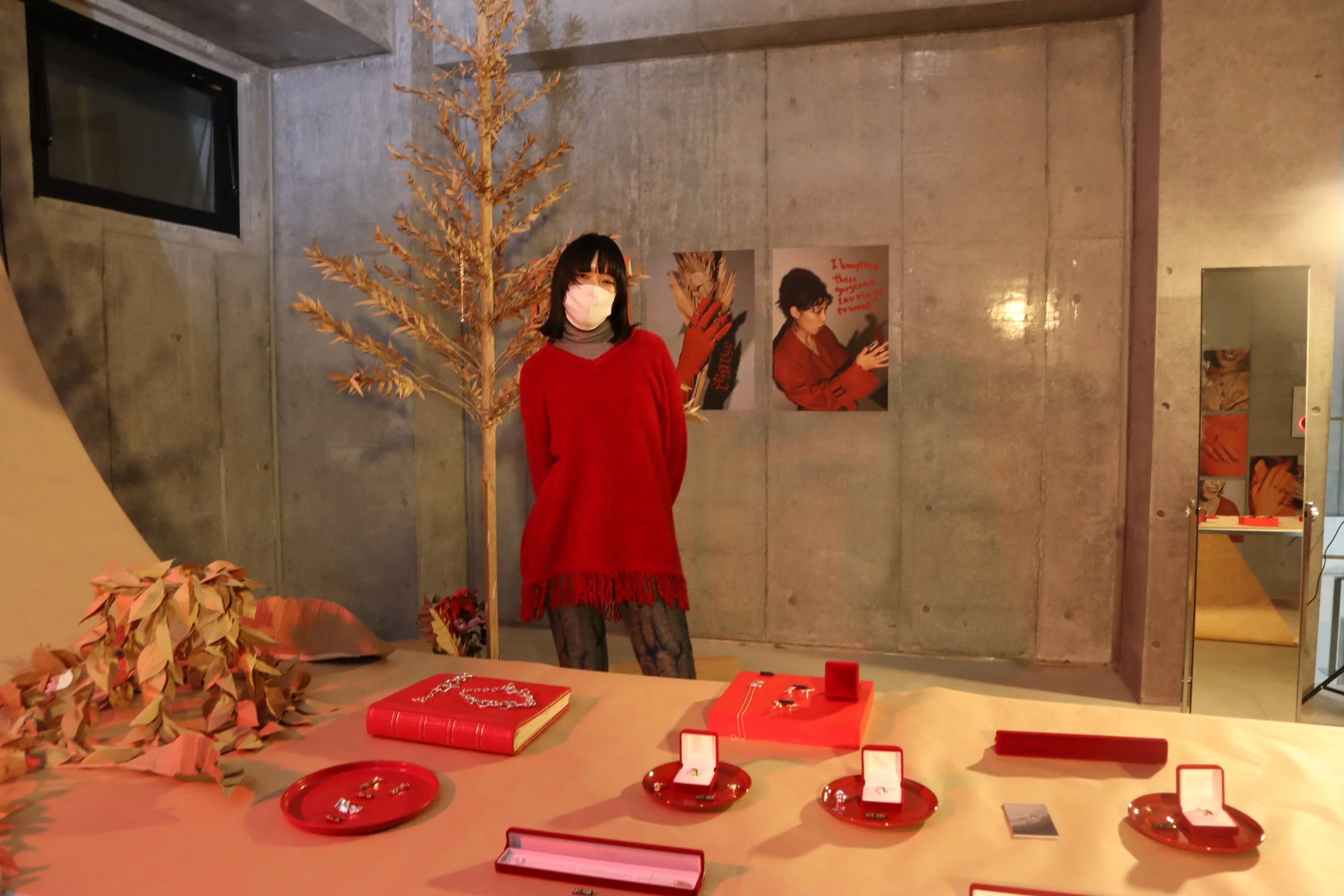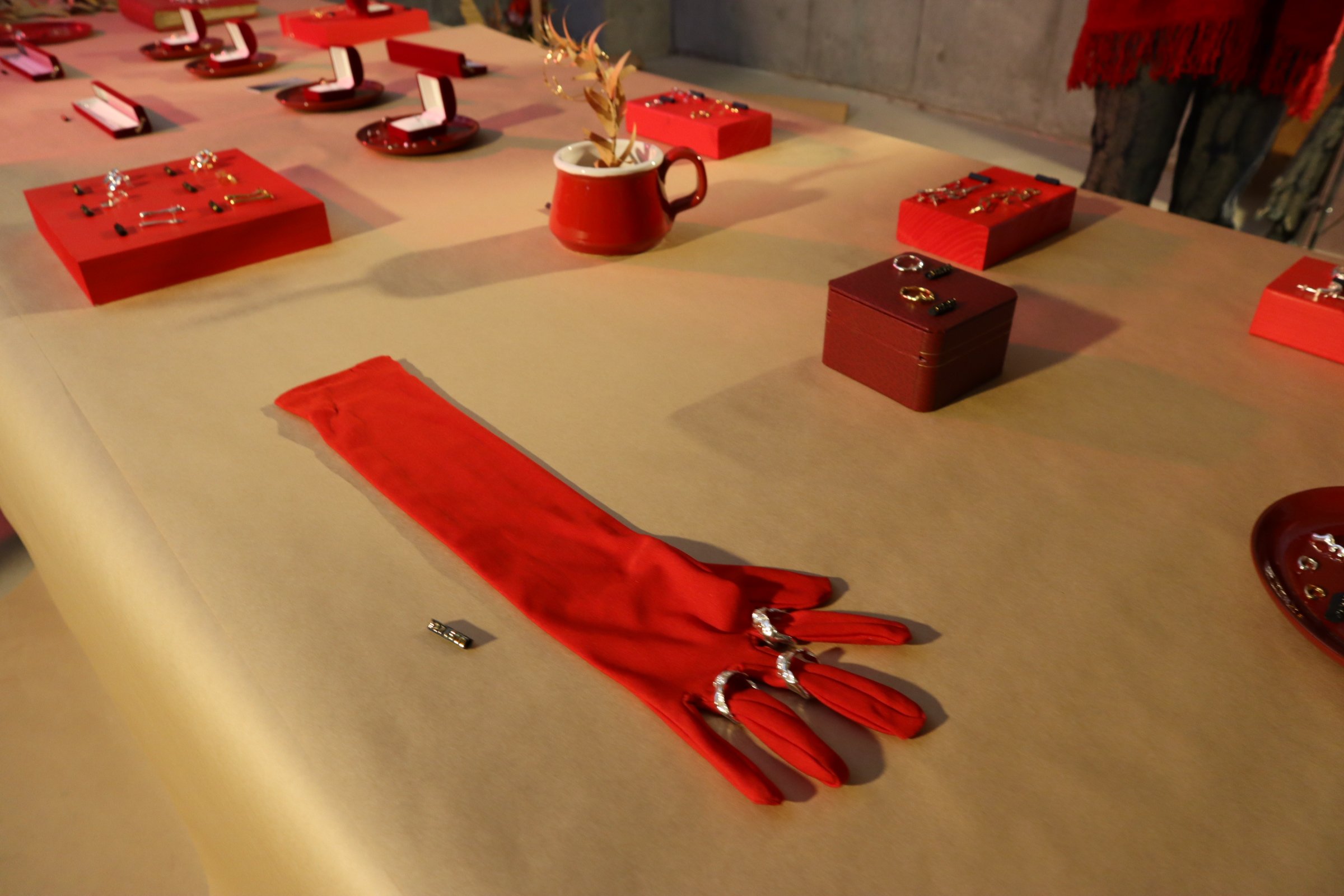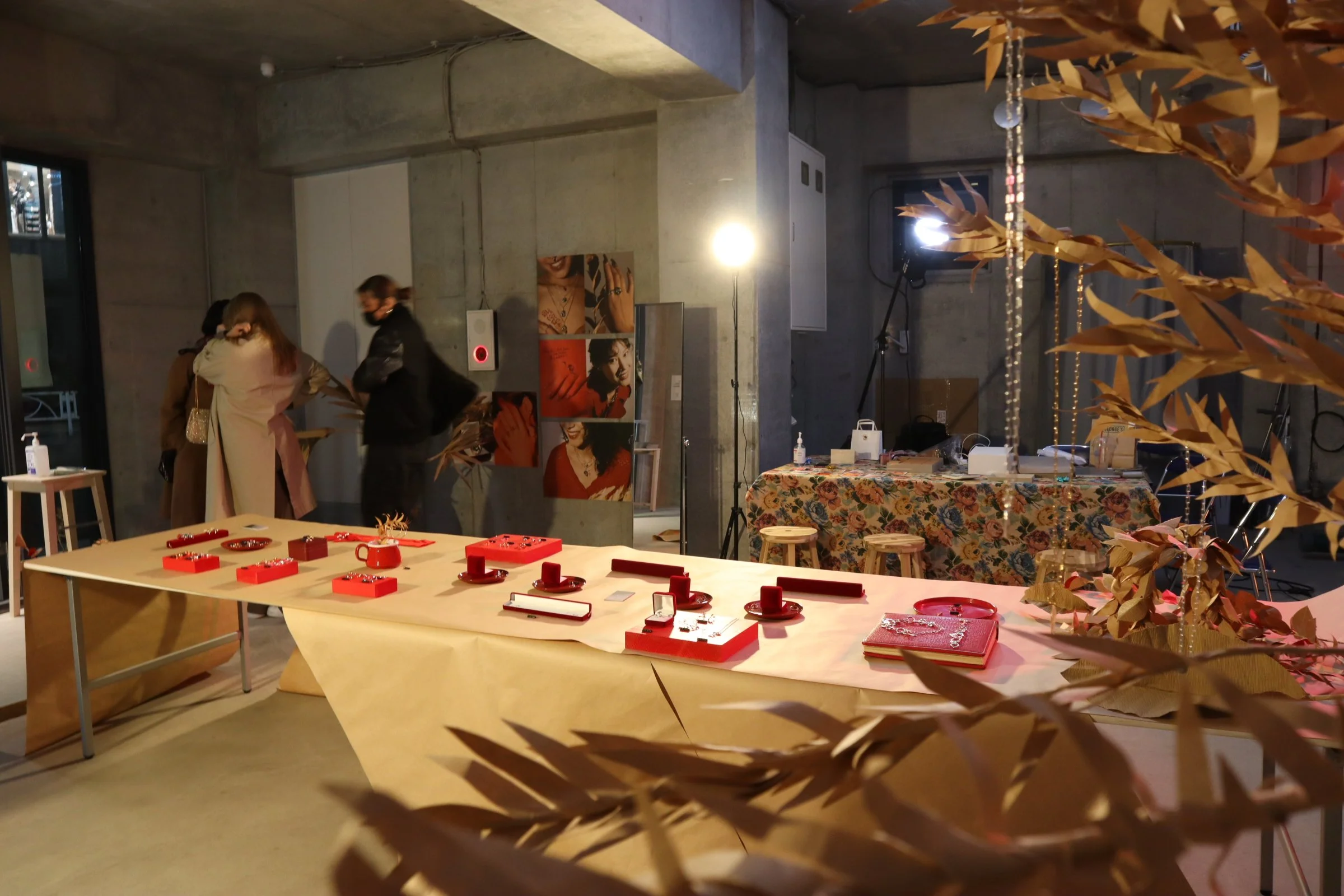 赤い光で照らされた会場。天井からクラフト紙が吊るされ、その先に赤色を基調とした展示物とともにジュエリーが並べられた、そんな大胆な展示にドキッとさせられ、TALANTOさんが作る世界に魅惑されていきました。