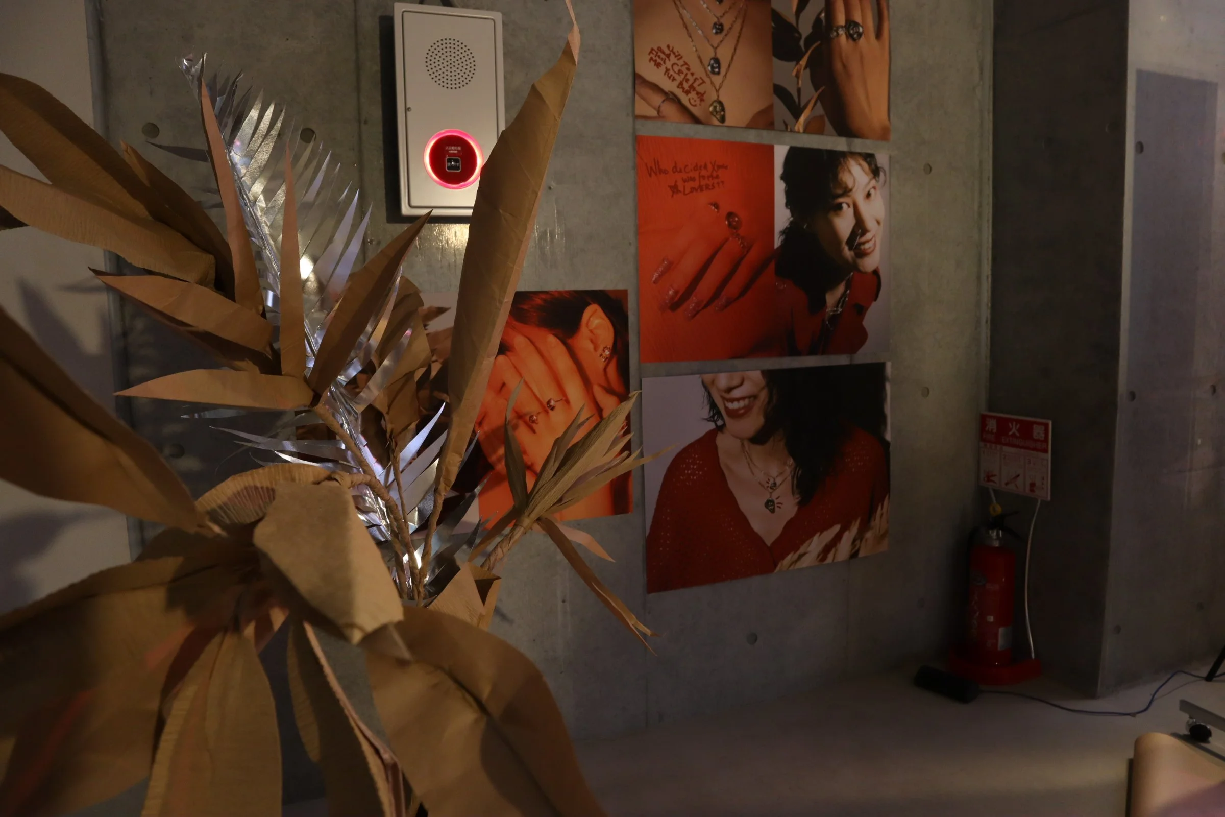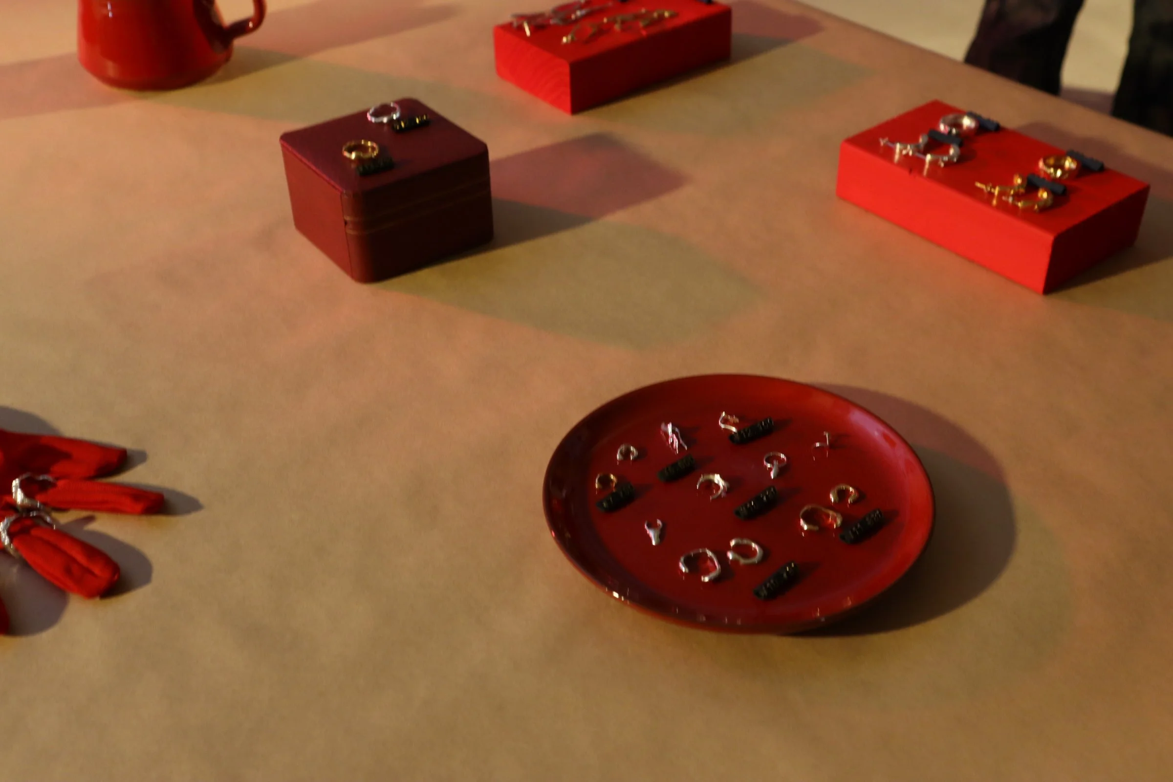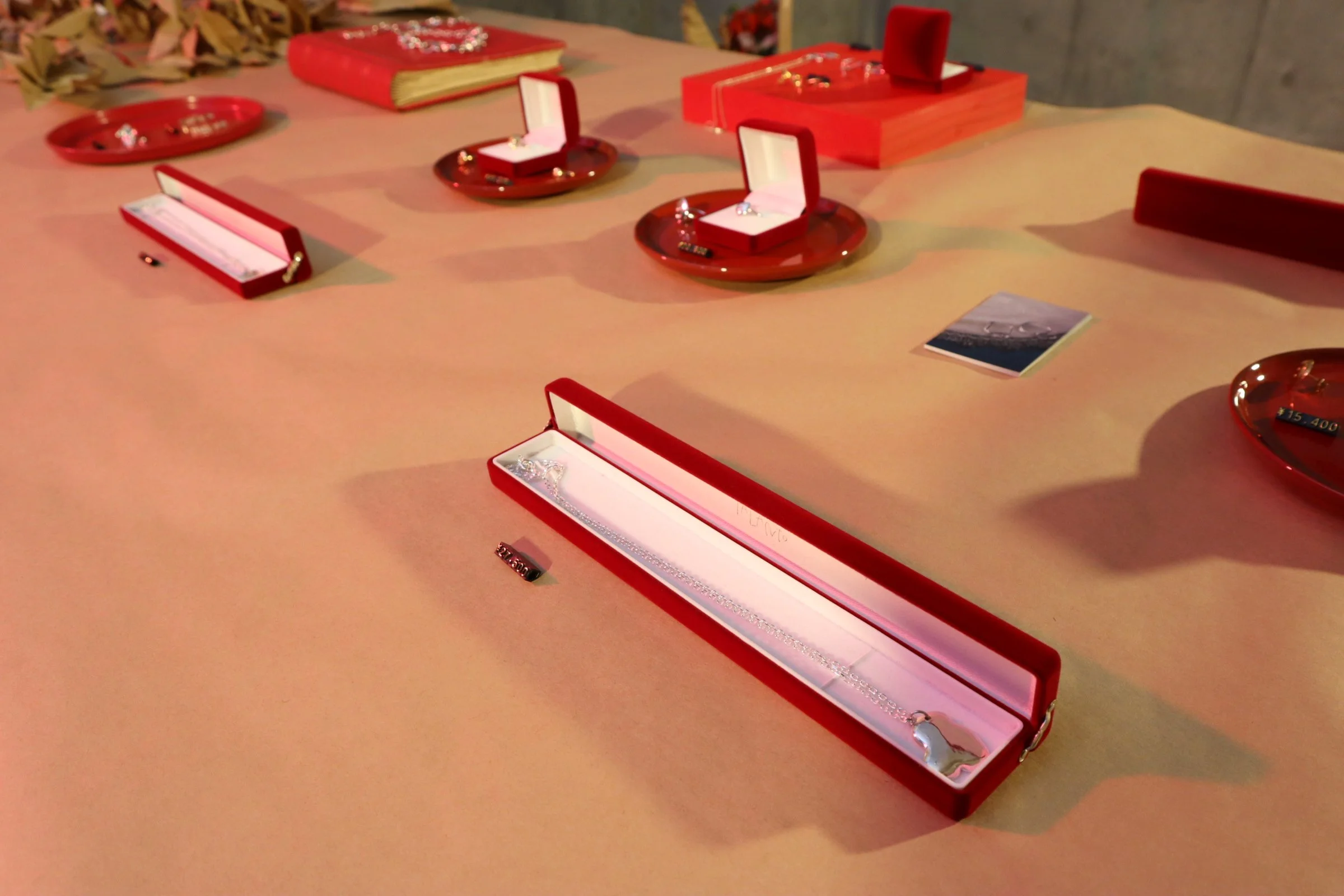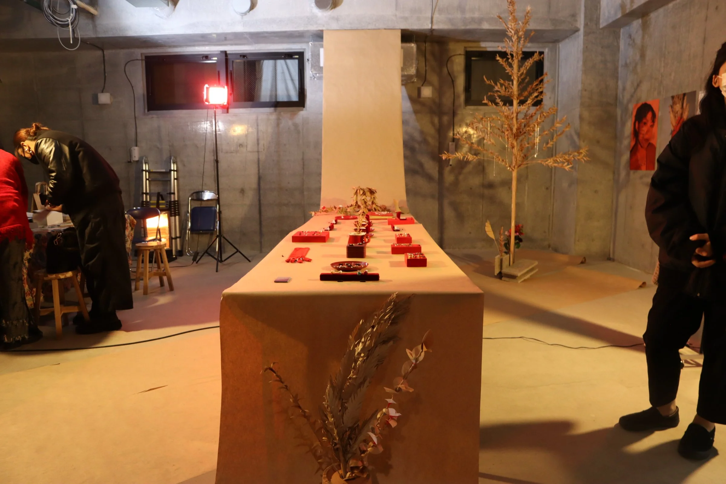 赤い光で照らされた会場。天井からクラフト紙が吊るされ、その先に赤色を基調とした展示物とともにジュエリーが並べられた、そんな大胆な展示にドキッとさせられ、TALANTOさんが作る世界に魅惑されていきました。