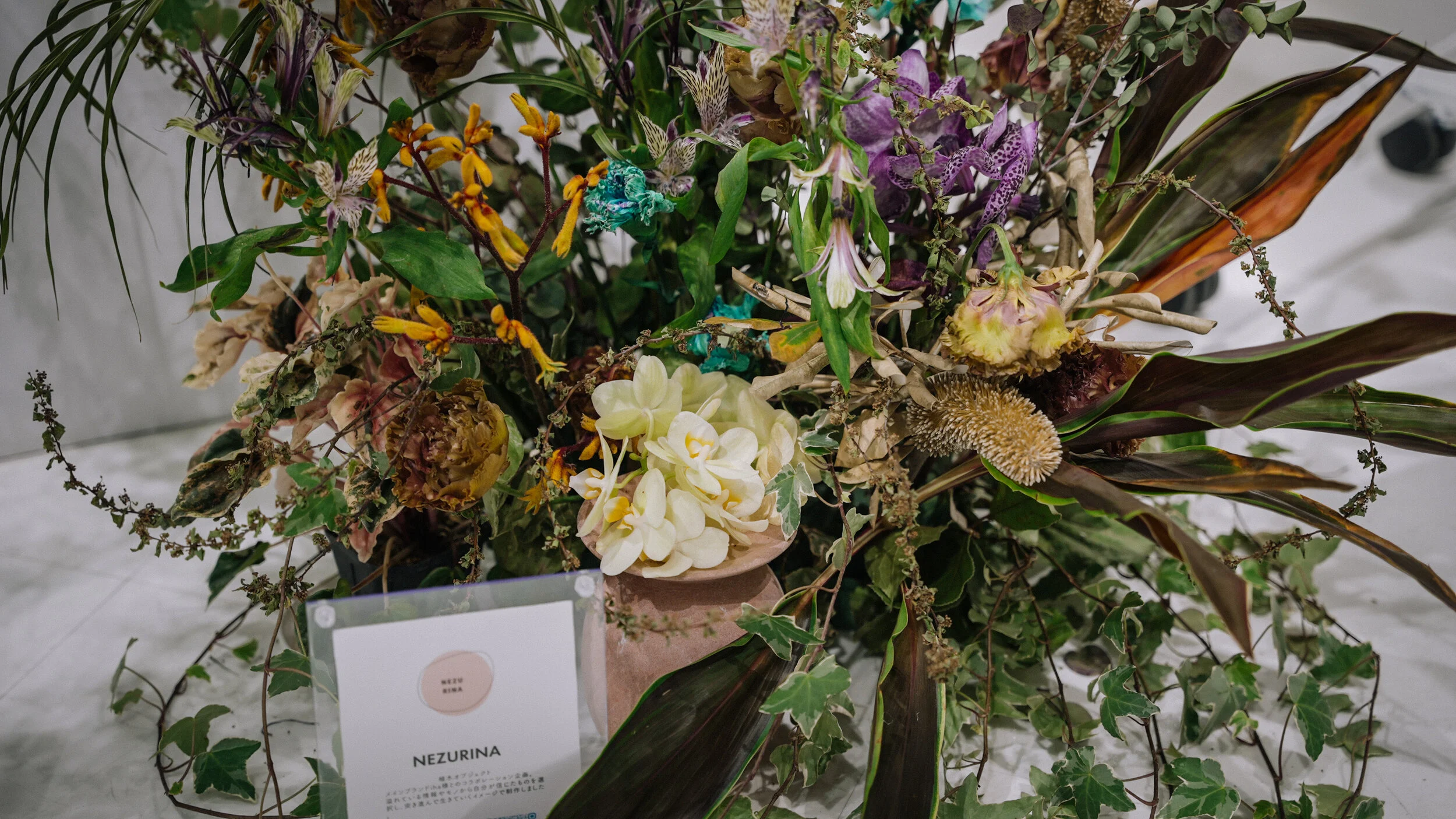 イベント期間中、イベントで購入した生花などをお持ちいただくと、作品の瓶の中にお花を追加することができます。スタッフにお声がけください。
