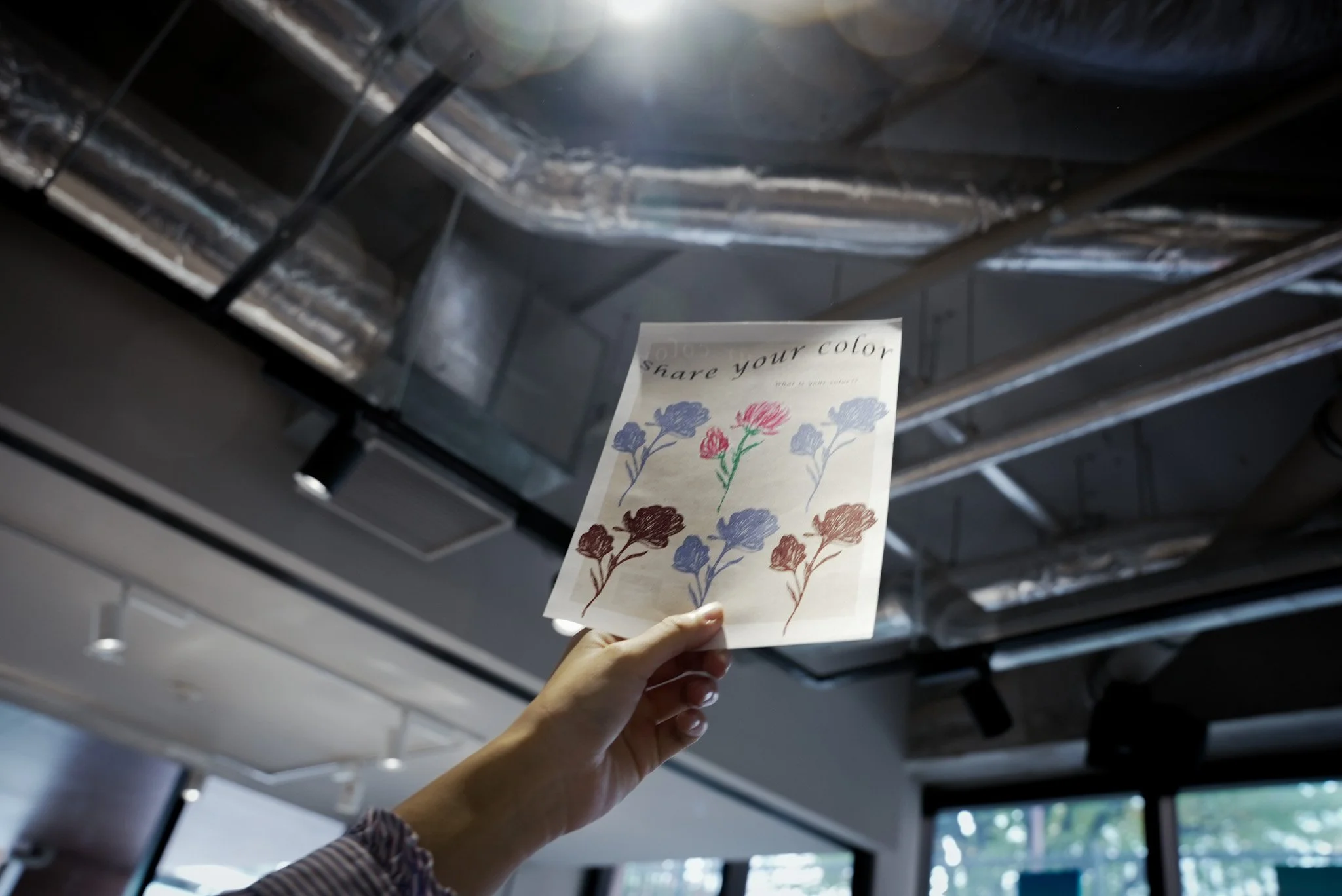 中央の花は、色鉛筆で自分の花を彩る塗り絵となっています。コンセプトであるShare your colorを体現して頂く事ができ、皆さん夢中になって色塗りをしていました。