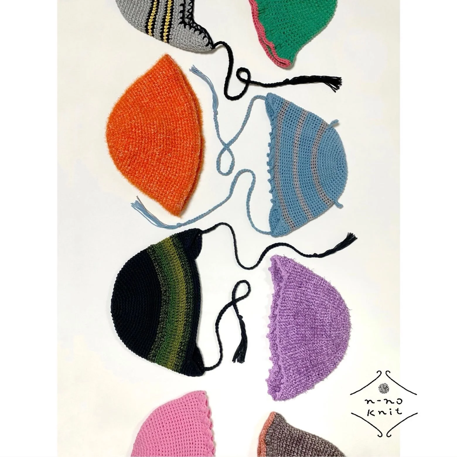 n-no knit です。 ひとつひとつ手編みながらデザインを考え、制作しています。 日常に使いやすく、でも個性も主張出来る、お気に入りが見つかります。 素材やデザインはもちろん、特にかぶった時のシルエットにこだわりがあり、ニット帽子が苦手な方にも是非試着してみて頂きたいです。