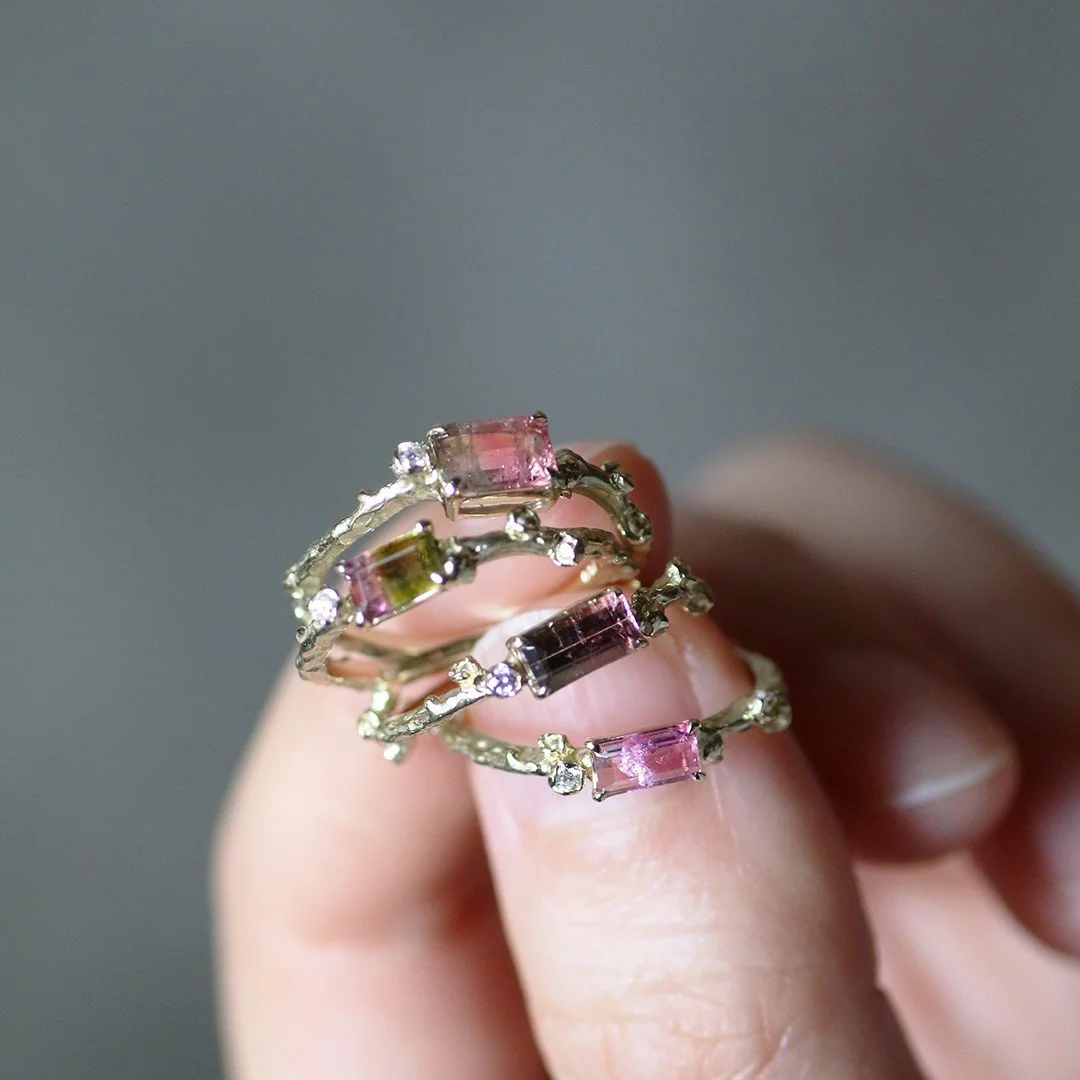 温室で咲く小さな花のようなピンクのバイカラートルマリンで仕⽴てたリング。ミニサイズなのでお手持ちのリングと重ね着けにもおすすめです。