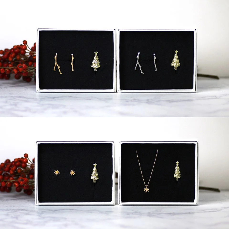 オリーブの花つぼみのネックレス(K18)・ピアス(K18)、羊飼いの小枝のピアス(K18、Pt900)がそれぞれミニツリーのオブジェとセットになった京都 蔦屋書店限定ギフトセット。