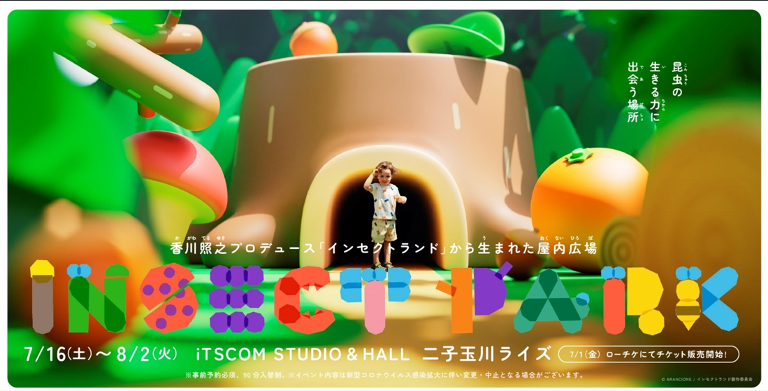 複合型商業施設「二子玉川ライズ」は、文部科学省「こどもの教育応援大使」も務める香川照之氏がプロデュースする自然教育アニメ『インセクトランド』の世界観を体感できる昆虫目線の屋内プレイグラウンド『INSECT PARK(インセクトパーク)』を、iTSCOM STUDIO & HALL 二子玉川ライズにて、2022 年7月16 日(土)~8月2日(火)の期間限定でオープンします。
