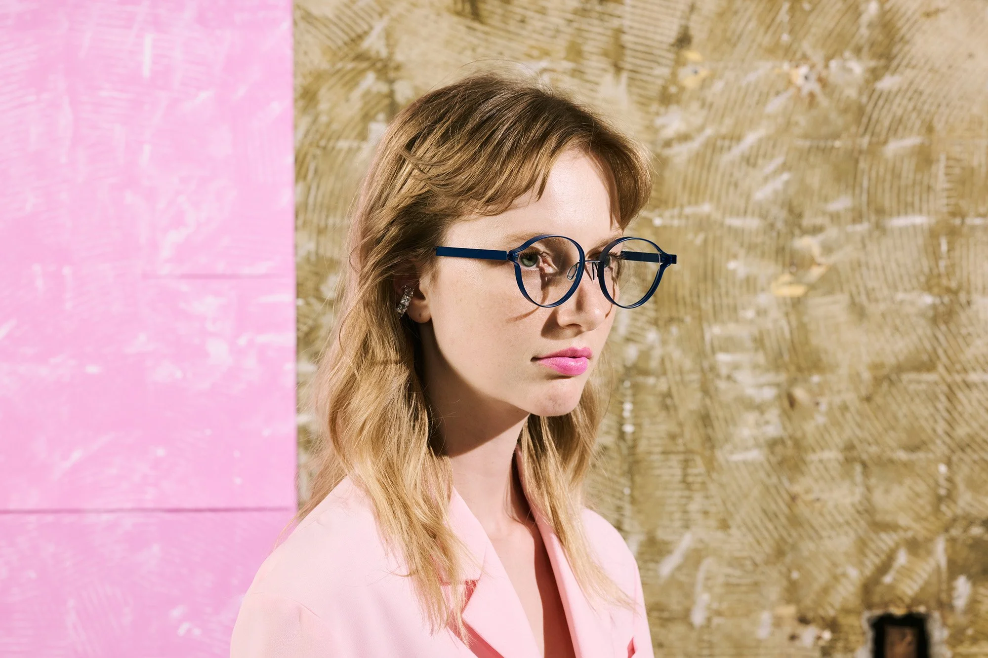1stプロダクトのラウンドシェイプは一見すると個性的な印象ですが、意外にもどなたでも似合いやすい形。正面から見るとスッキリとした「線」のデザインで顔に馴染みやすく、レンズは大きすぎず小さすぎず程よい大きさ。TWOFACE の顔とも言えるアイテムです。