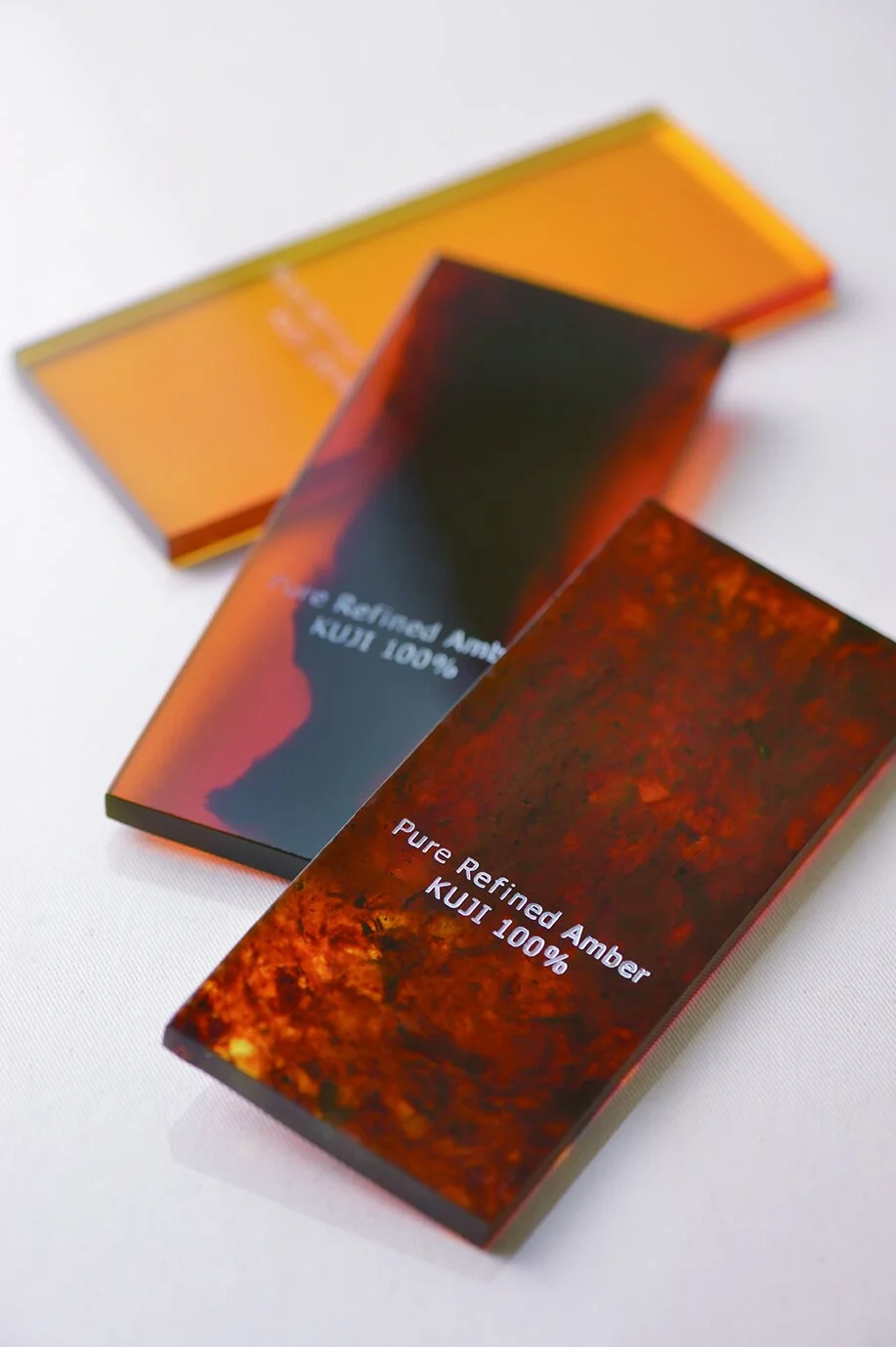 悠久の自然が育んだ有限の琥珀だからこそ、その小さな琥珀のかけらも余すところなく活用できるように、久慈琥珀(株)が研究を重ねて生まれたのが「リファインドアンバー」という素材です。