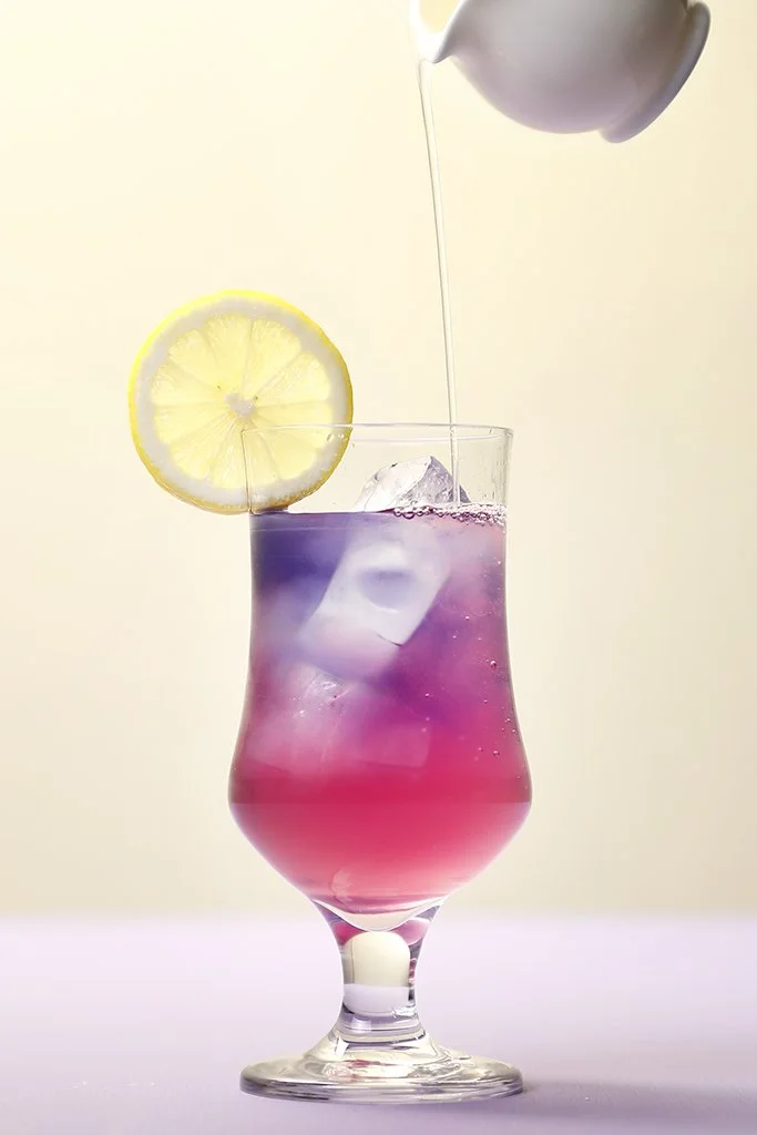 バタフライピーのシロップを炭酸で割り、後からレモン果汁を加えることで、色鮮やかなスカッシュに仕上がります。