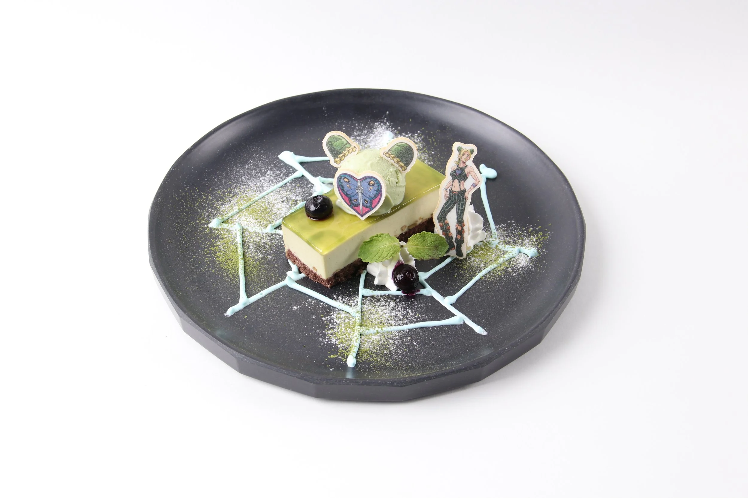 ピスタチオアイスに徐倫のお団子をかたどったモナカをトッピング。徐倫の胸の蝶マークのモナカを添え、下にはホイップで糸を表現しました。