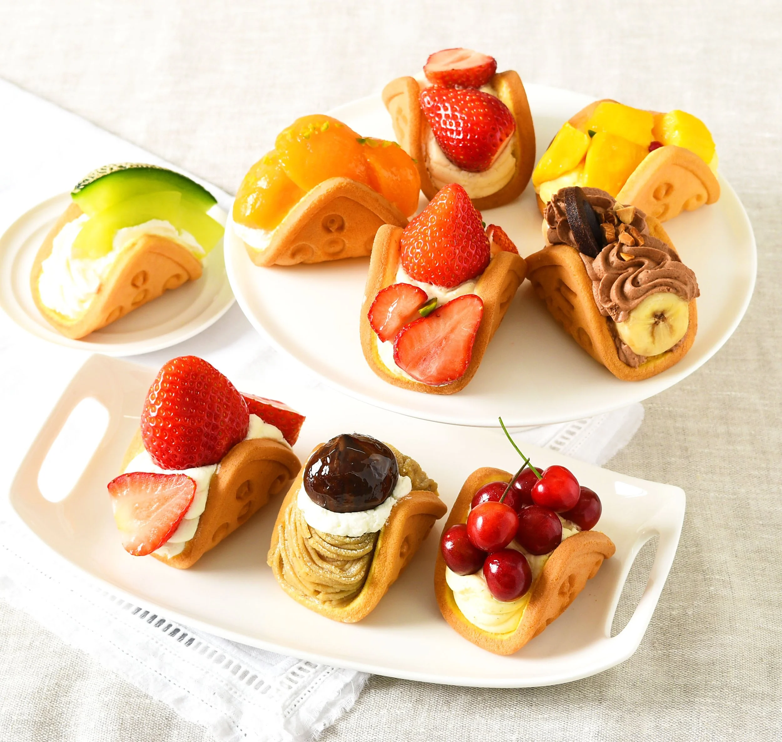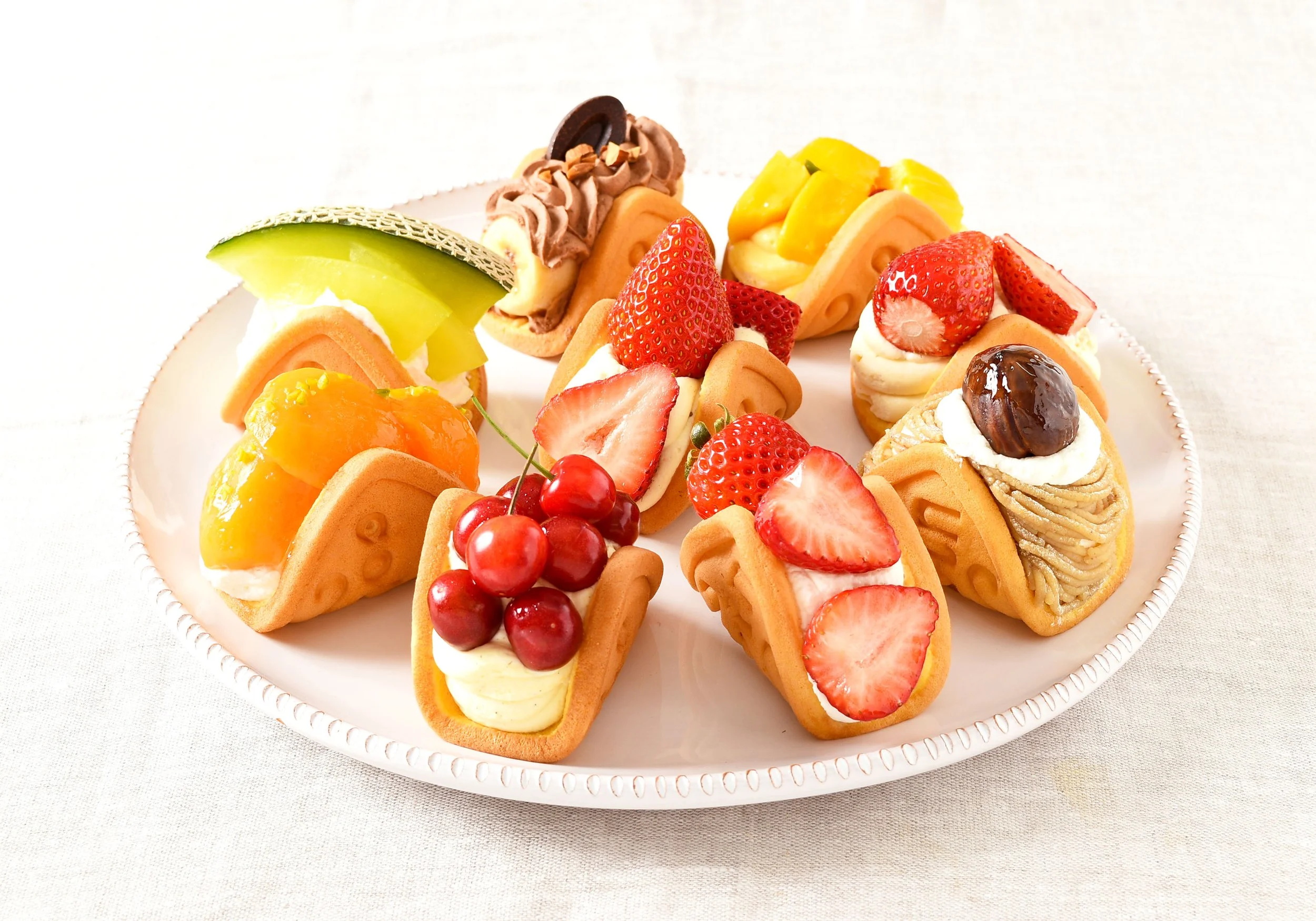 ・クリーム(こくのあるリッチな生クリームや、こだわりのディプロマットクリーム、モンブランクリーム、ハイカカオのガナッシュクリーム、フレッシュチーズのクリームなど、ワッフルごとに異なる味わいです。それぞれのフルーツとペアリングが楽しめます)