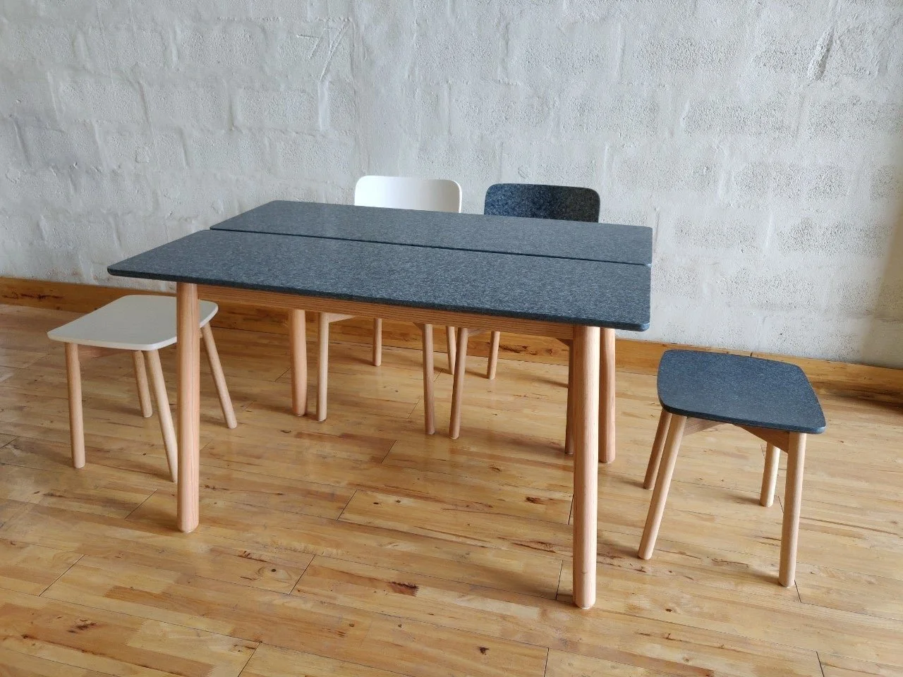 「STELAPOP」は、デニム製品の生産工程で出る裁断くずや捨てられてしまうデニム製品などの繊維ごみをアップサイクルして製造した建材、そしてそれを使用した家具ブランドです。本展示では、サステナブルであるとともに、繊維の表情や色が分かるユニークな材を使用したテーブルや椅子で、ゆっくりと展示内容を振り返るカフェスペースをご用意しました。