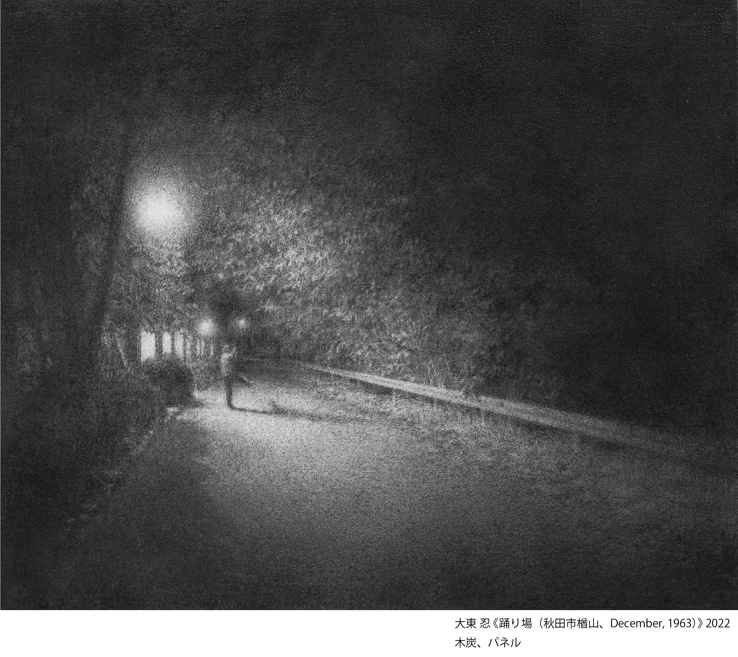 住宅街や人口過疎地など、人間の営みや記憶がはびこる風景から「痕跡」を読み取るため、盆踊りやミュージカルを踊り、思索を重ねる。本展では秋田県の風景を舞台に、身体を澄ますために踊り、風景を「踏み慣らす」ことで境界や道をつくり、「踏み鳴らす」ことで風景の声に耳を傾け鎮魂し、祝福を表現した木炭画を中心に展示する。