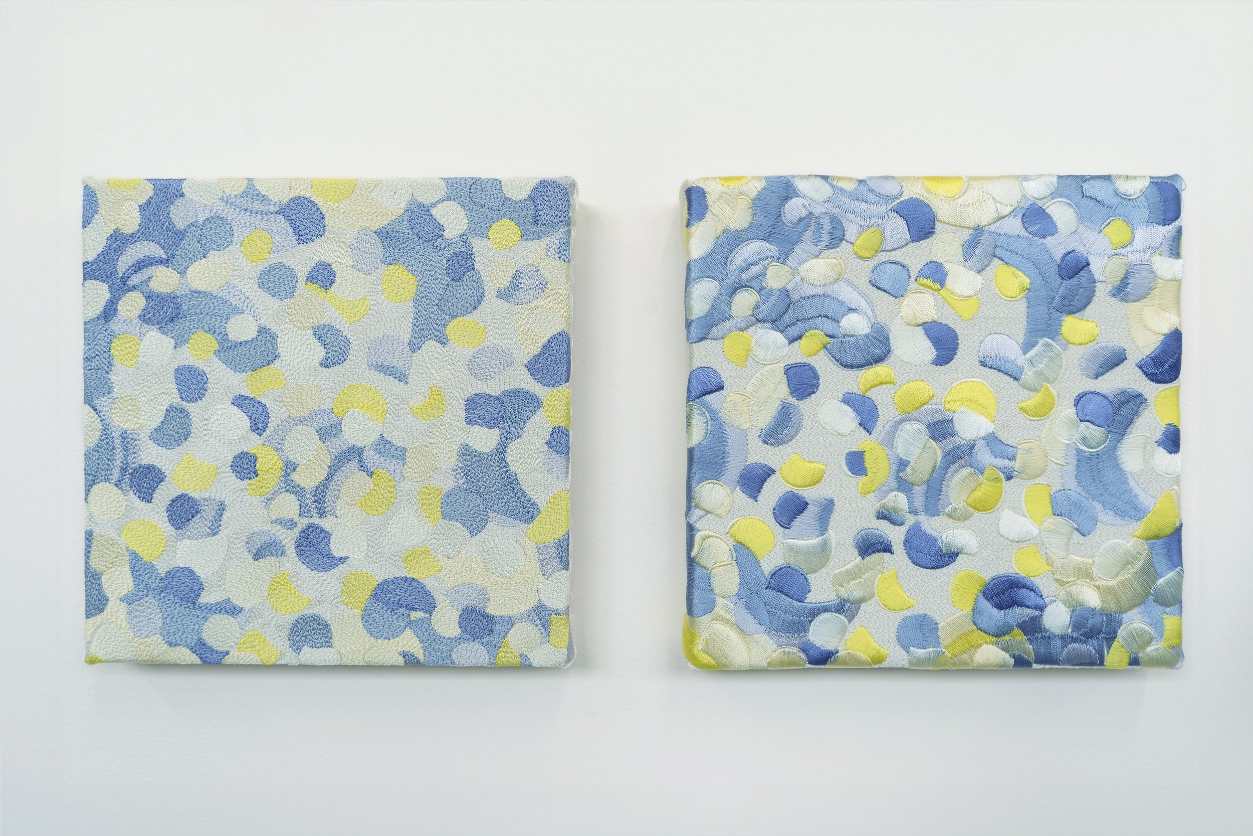 今回、岡村氏の抽象画に現わされる大胆な色彩感とその奥行き、有機的なストロークから感じられる独特な筆致を刺繍として再解釈し、刺繍による表現を新たな角度で追求しました。