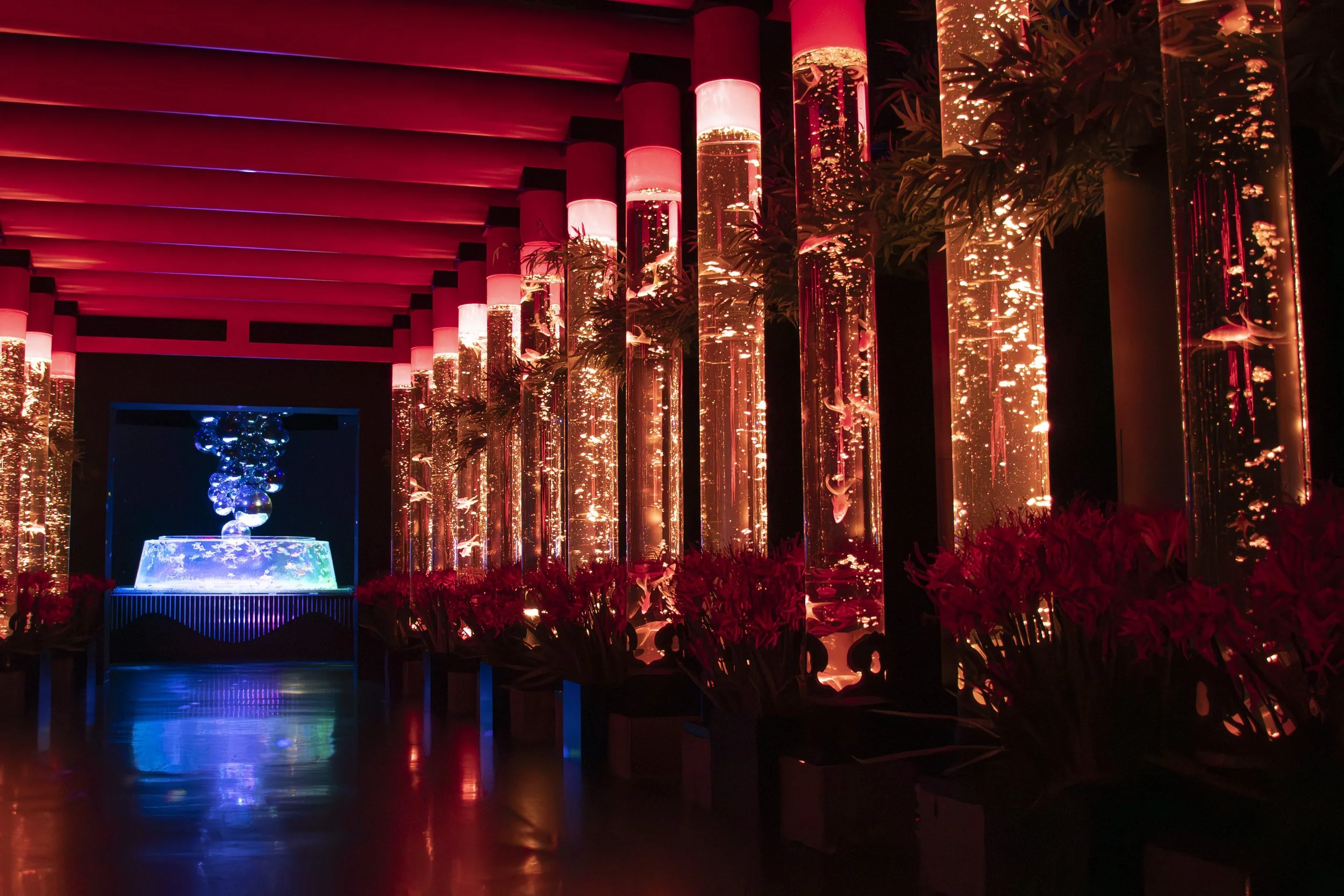 寺社建築に見られる回廊を表現した空間に立ち並ぶ金魚の列柱。ずっと続いているかのように見えるこの空間をイチョウが飾り、秋の風情が広がる空間に染まります。