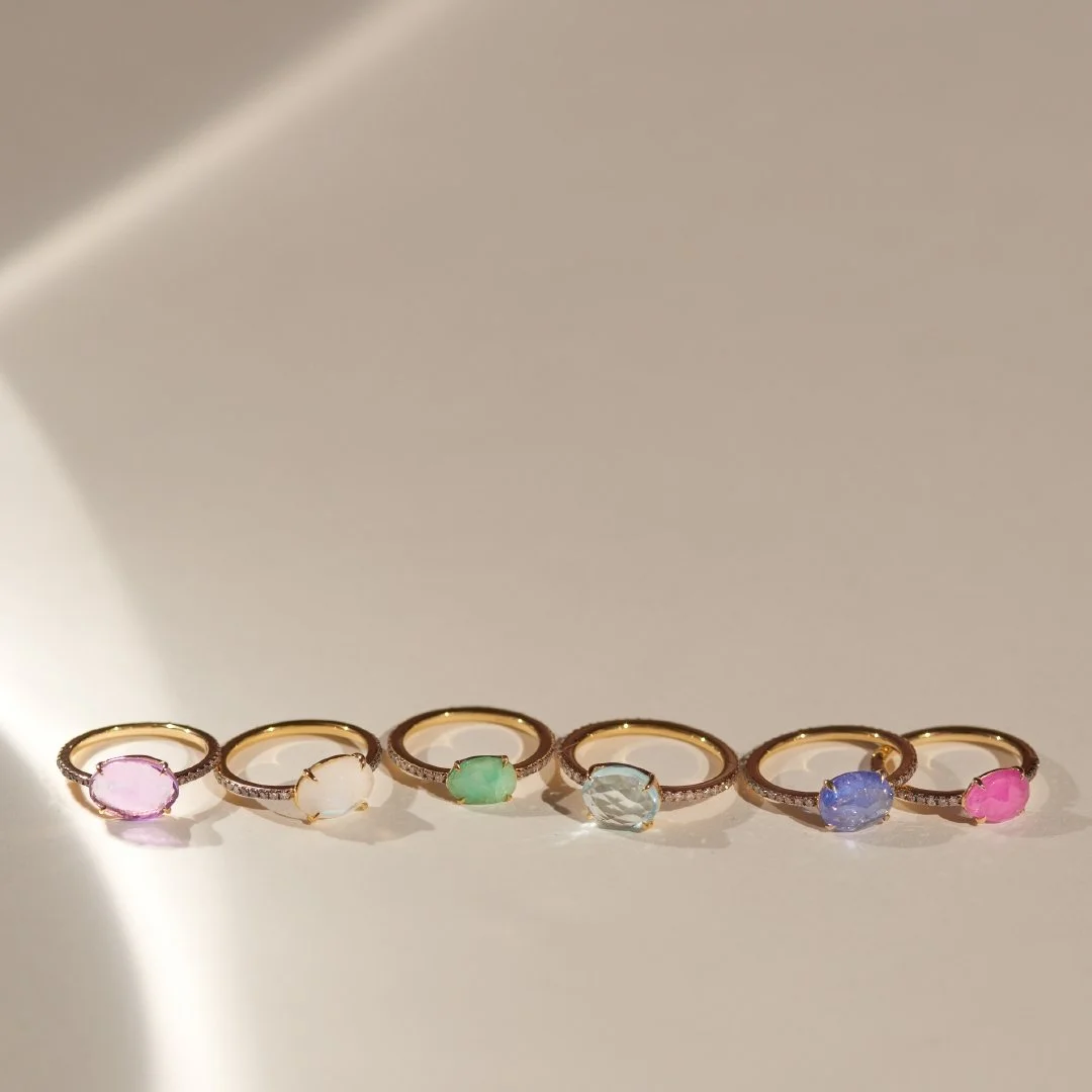 彩りあふれるカボションカットのカラーストーンを覆輪留めにして乗せたリング。