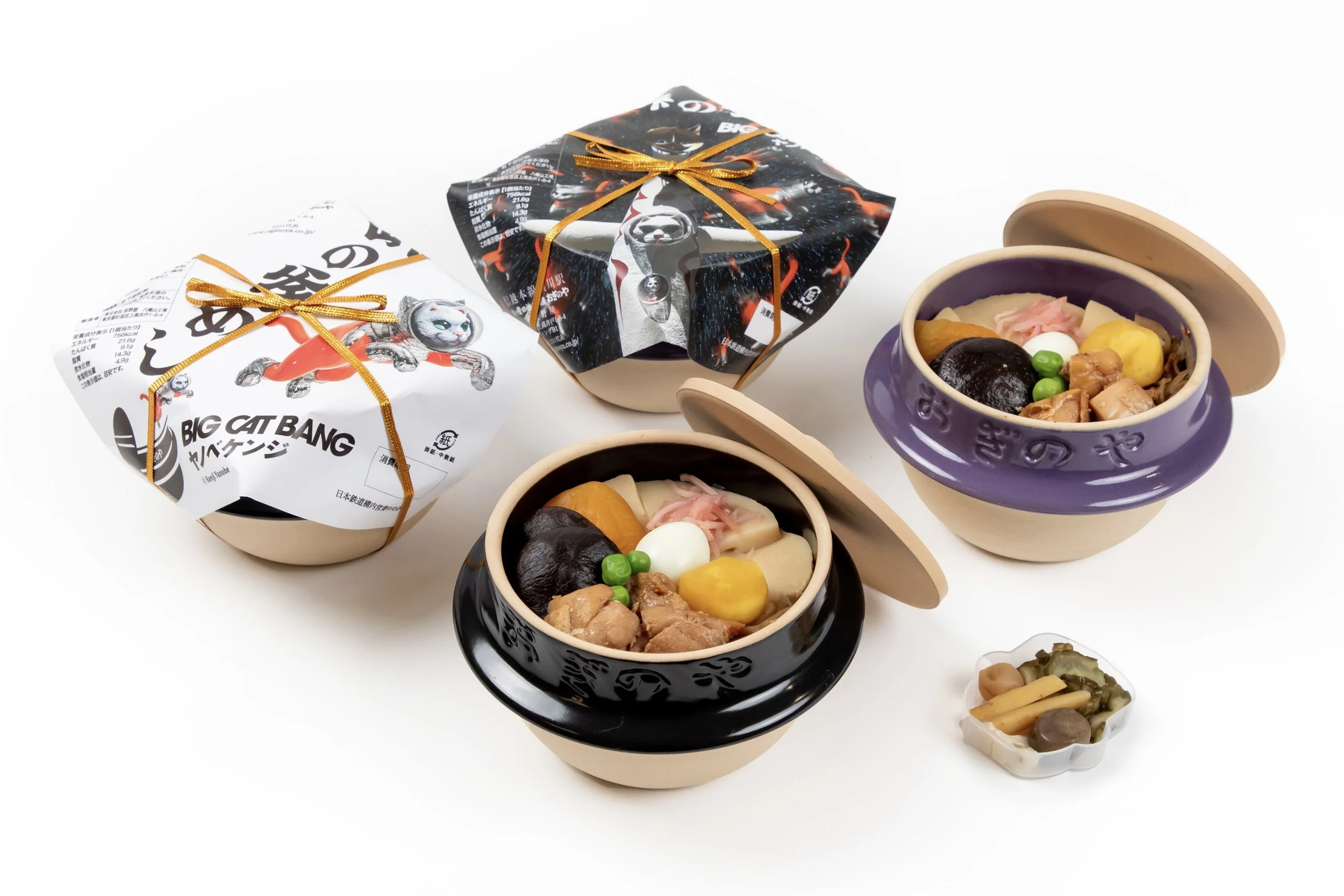 販売開始から60余年、皆様から愛されている荻野屋の人気商品「峠の釜めし」に、ヤノベケンジ氏が描く「BIG CAT BANG」イラストを使用した掛け紙をかけた限定商品です。峠の釜めしの特徴である益子焼の器は、イラストの世界観に合わせ特別カラーをご用意しました。販売時期により、異なった掛け紙と特別カラーの釜をお楽しみいただけます。