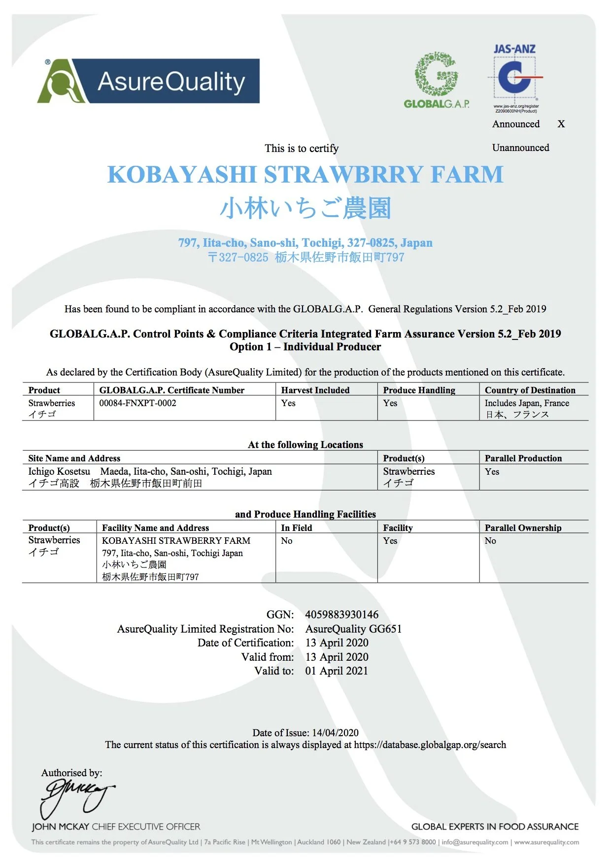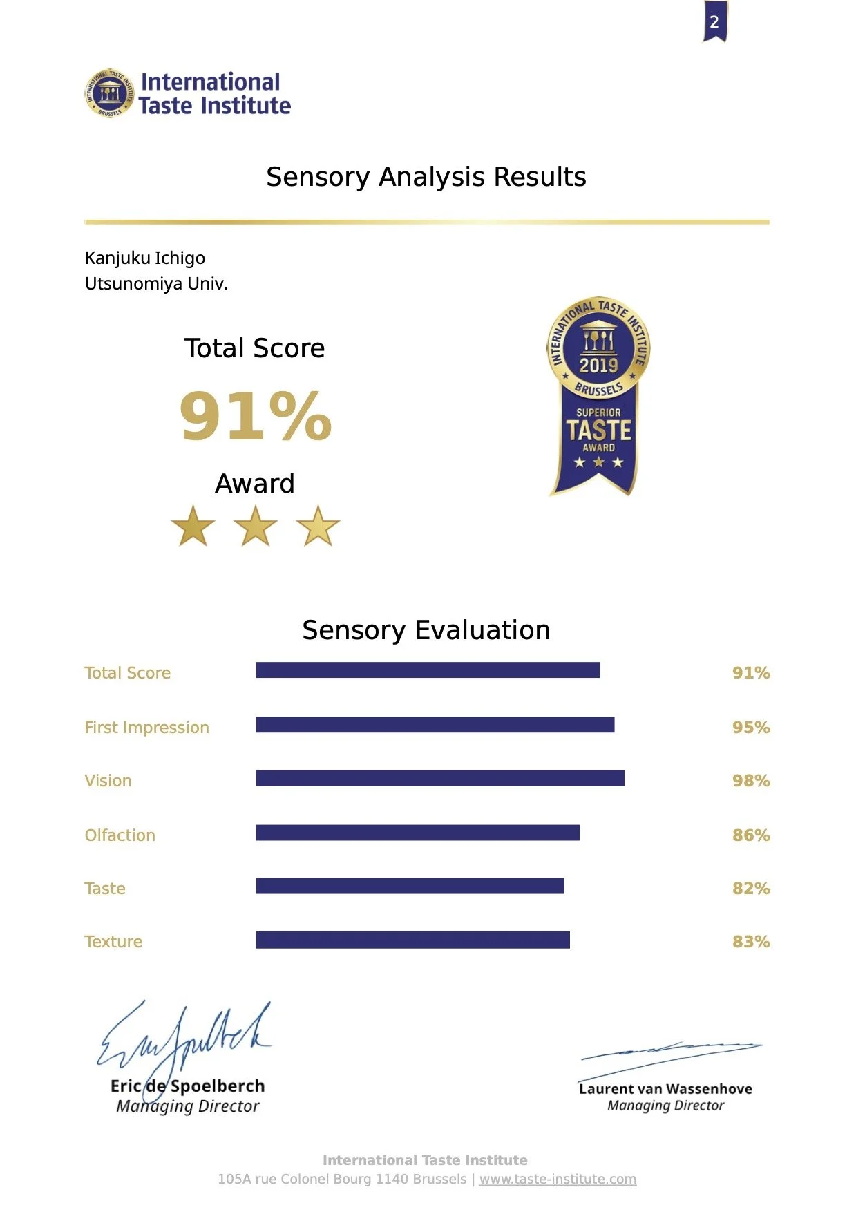 生産者である(株)KSFではGLOBAL.G.A.P.(※2)に準じたイチゴ(栃木県品種スカイベリー)を安定栽培しており、小林正史氏が生み出すイチゴは、2019年に国際味覚審査機構(※3)が行う優秀味覚賞で青果物で世界初の3つ星を受賞した経歴を持っています。