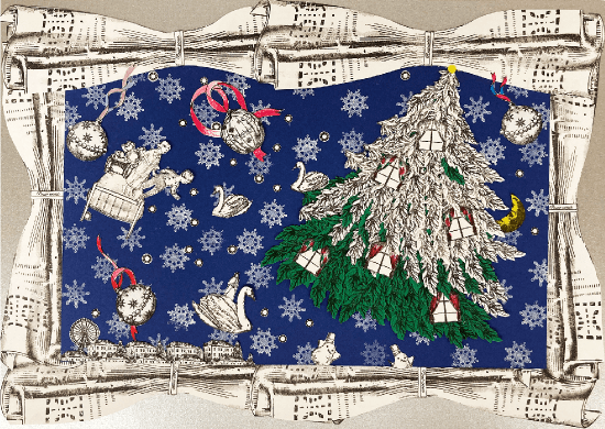 繊細な切り絵で描かれた、クリスマスの世界観。 「nekonekodesign PAPER ARTS」 (左)二つ折りクリスマスカード (1枚)935円、 (右)リース型クリスマスカード 935円