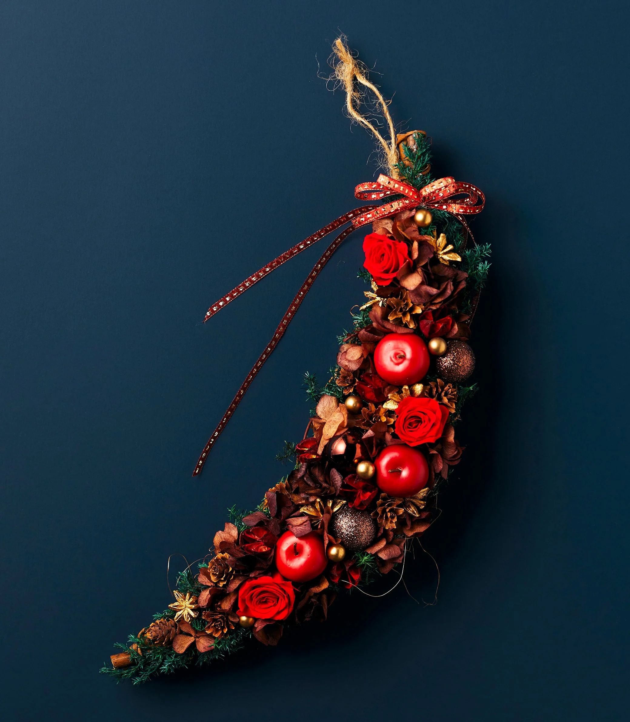 プリザーブドフラワーやアーティフィシャルフラワー、木の実をふんだんに使った華やかなオーナメント。 「花贈り」クリスマスのハーフムーンスワッグ(全長約41cm)6,380円 ※12月1日(水)~7日(火)