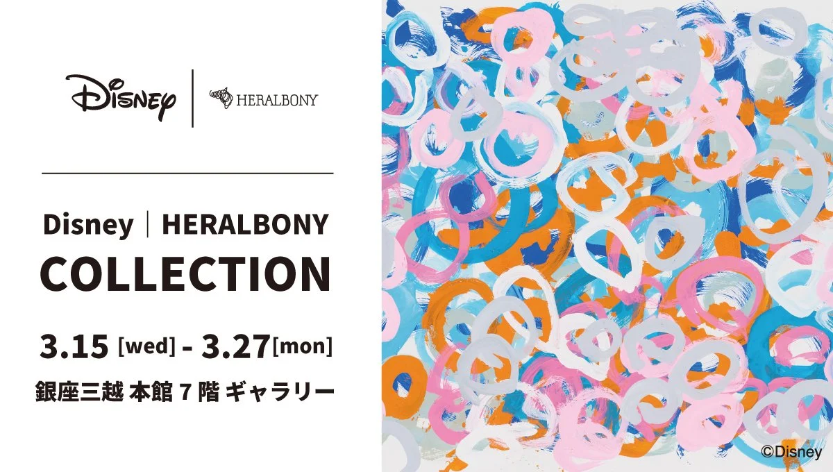 今回の催事では、銀座三越で同時開催される「Disney PREMIUM MARKET」のメインビジュアルのミッキーマウスとミニーマウスの衣装に、Disney| HERALBONYのアートをあしらったビジュアルを制作。同デザインのスカーフやアートパネルなどのアイテムの販売も予定しています。