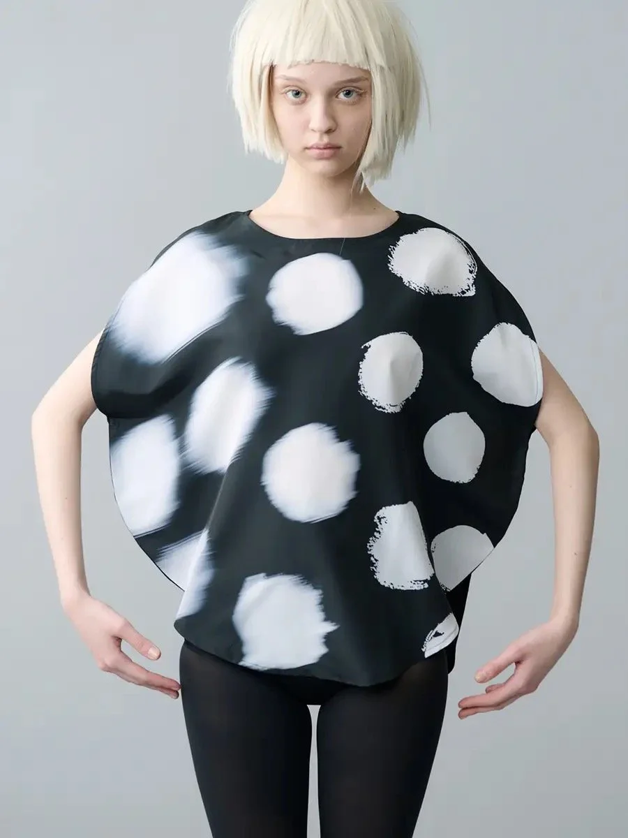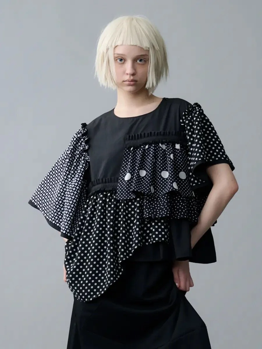 アシンメトリーなフレア袖デザインに「Unclear(曖昧)」シリーズのdodot.オリジナルドット柄をプリントした変形ブラウス。細かく入れたフレアプリーツでボリューム感たっぷりなデザインです。