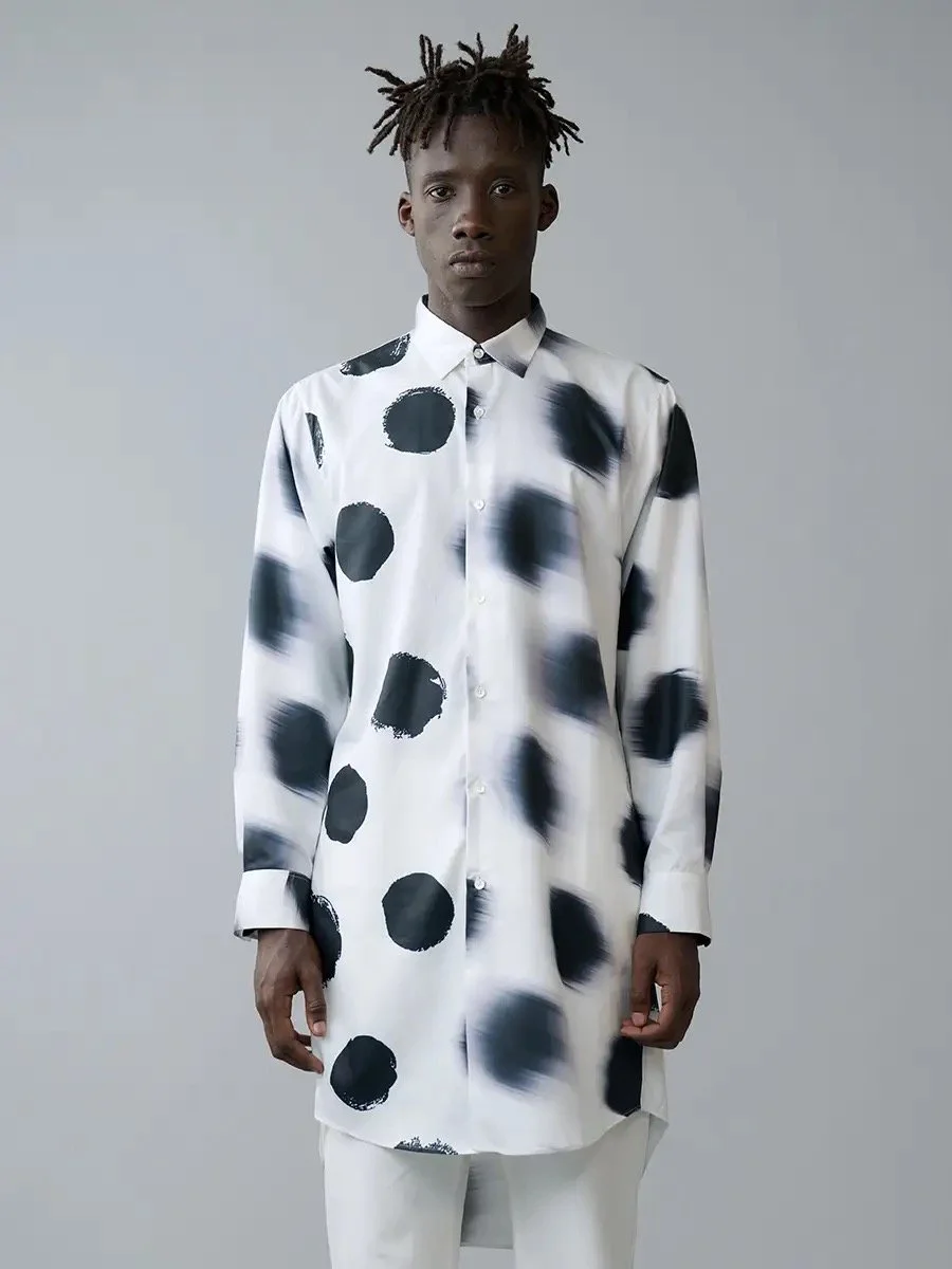新作「Unclear(曖昧)」シリーズのdodot.オリジナルドット柄を入れたグラフィックロングシャツ。曖昧にぼやけたドットとくっきり輪郭のあるドットが共存し、存在感のある一着です。