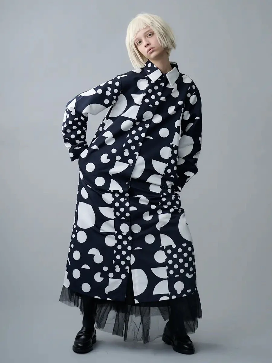 ランダムに切り貼りされた、インパクトのある幾何学的ドットグラフィックを使用したシャツワンピース。ゆとりのあるシルエットで、着やすいデザインに。