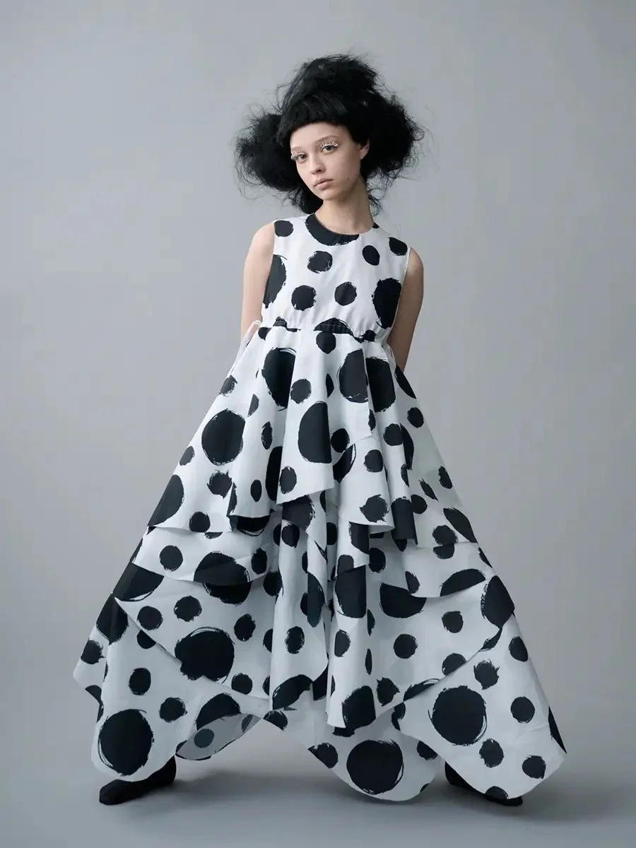 ランダムに入れたドレープディテールで、ふわりと軽い質感にも関わらずボリュームを感じるドレスに、存在感のあるdodot.オリジナルの大きな手描きドット柄。胸下にドローストリングの絞りを入れ、シルエットにメリハリを出せるデザインに。