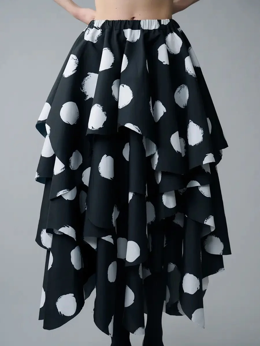 何種類ものドット柄を、アシンメトリーなデザインとフレアのディテールの中に組み込んだデザイン。スカートにもパンツにも合わせやすい丈感で、様々なスタイリングが楽しめます。