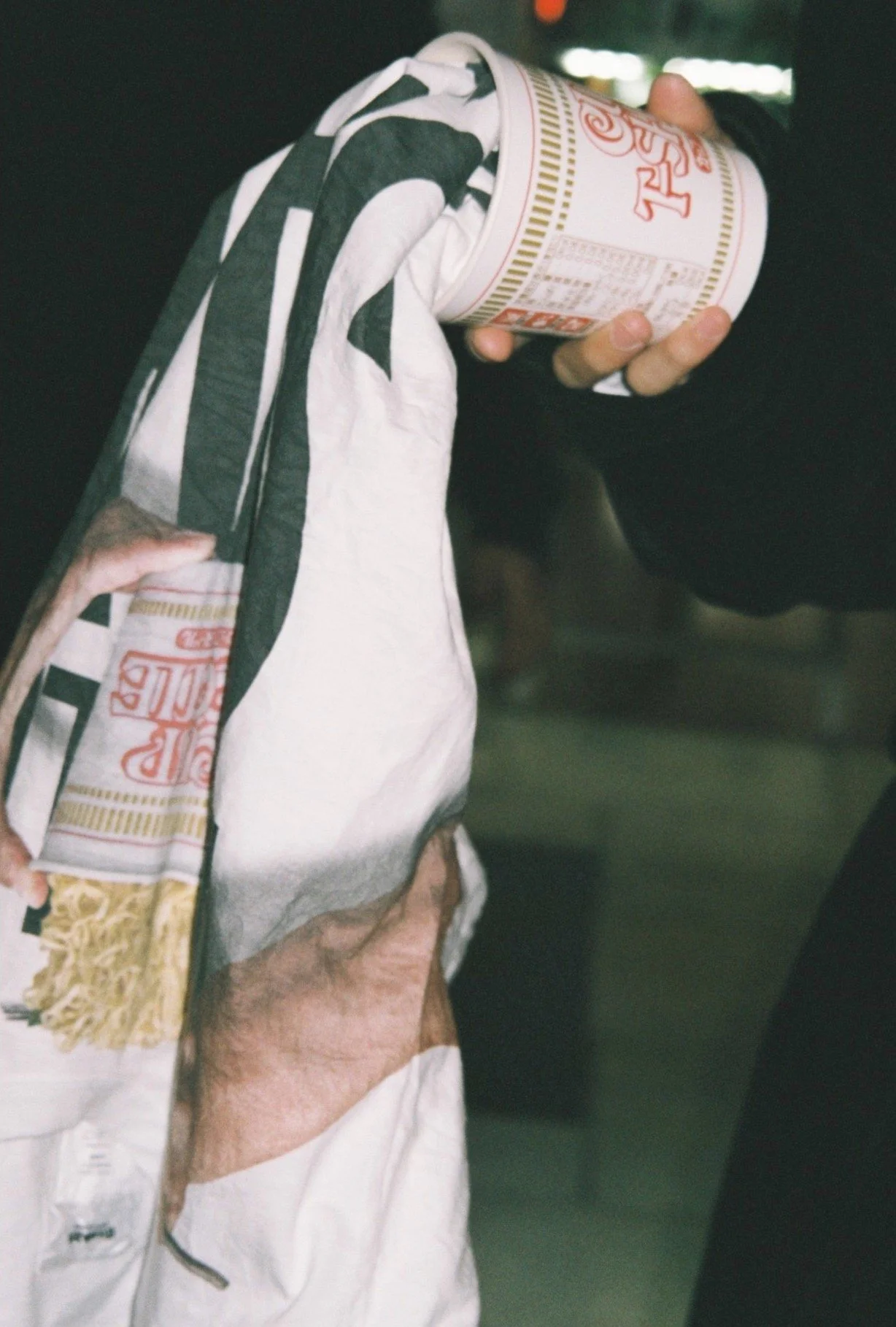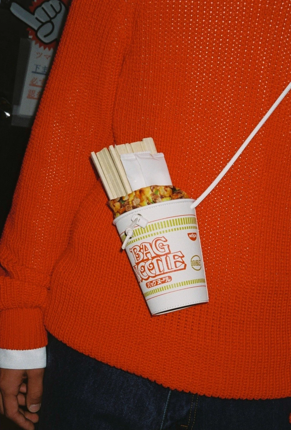 日本のプロダクトブランド「beta post」と「doublet」による、カップヌードルのパッケージをオマージュしたトリプルコラボバッグ。