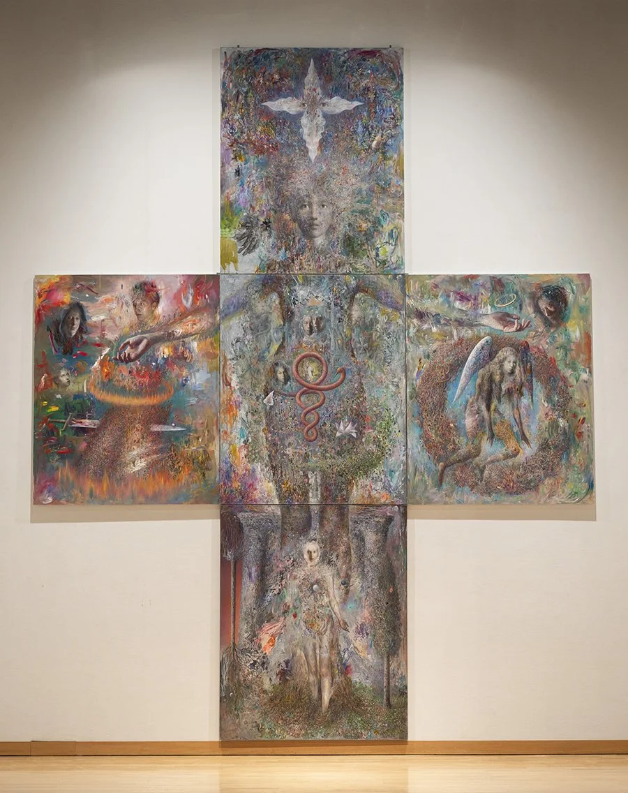 ⽇本の⽂化や歴史、それらを⾃⼰の解釈の元、現代的な価値観や視覚情報と照らし合わせ、画⾯上に油彩と現代的なマテリアルのレイヤー(層)によって表現する⽅法を試みています。また幼少期からアニメやゲームに影響を受け、アーティストとしての活動以外にも、キャラクターデザインやイラストレーター、デッサン講師などと多岐にわたる活動をしています。
