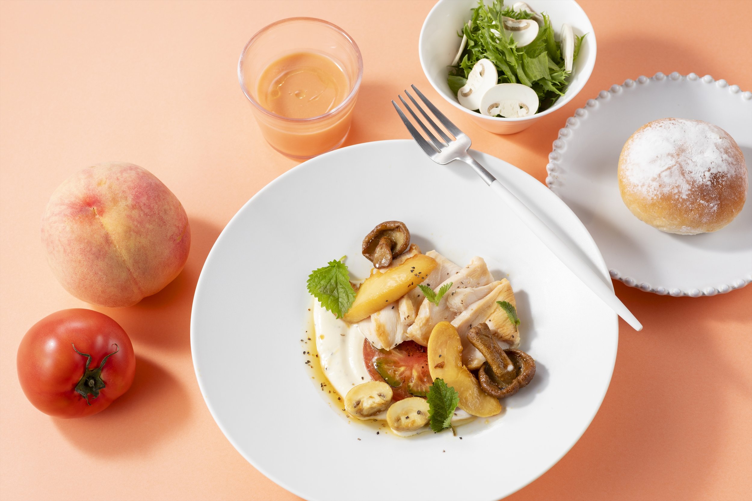 メインは「シャモと桃のソテー」。低温で丁寧に仕上げた福島県ブランド”川俣シャモ”はしっとり柔らかく、ヨーグルト風味の濃厚ソースと相性抜群。桃のソテーの甘みと酸味のバランスが絶妙な夏にぴったりな味わいです。また、食欲が落ちがちな暑い時季でもさらっと食べられる「トマトと桃の冷製スープ」は桃の甘みと香りがトマトの味わいがマッチする一品。GAP認証農産物をふんだんに使用した贅沢プレートです。