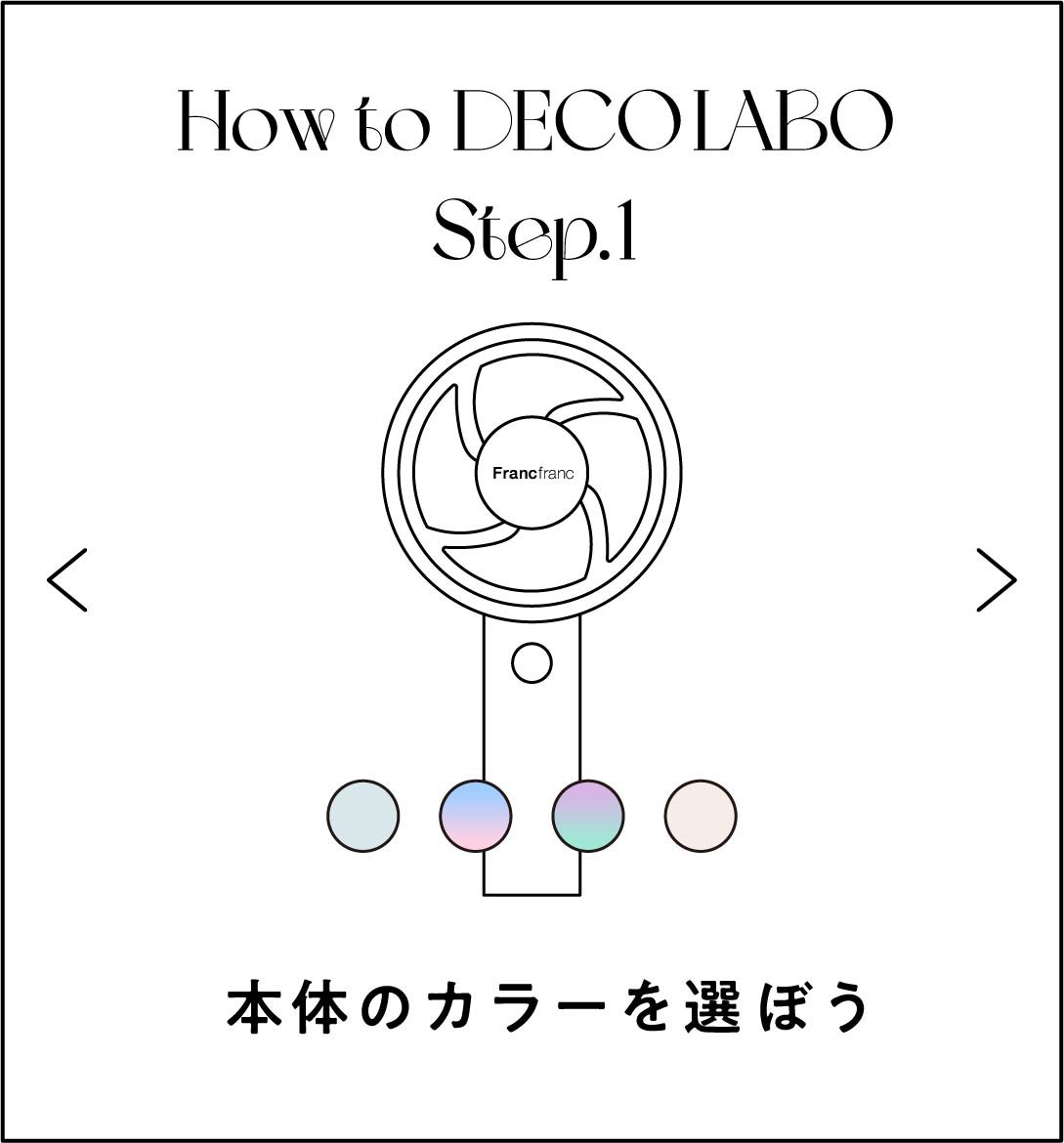 株式会社Francfrancが運営するインテリアショップ『Francfranc(フランフラン)』は、特設サイトで自由にデコレーションを楽しめるサービス『DECO LABO(デコ ラボ)』を2023年6月29日(木)より開始します。卓上でも携帯型でも使える2WAYタイプのUSB充電式小型扇風機「フレ ハンディファン」を特設サイト内で自由にデコレーションでき、商品本体とデコパーツがそのまま購入できるFrancfrancの新しいサービスです。2023年最新モデル全10種類の「フレ ハンディファン」とパーツを組み合わせて、世界にひとつだけのオリジナルハンディファンをお楽しみいただけます。