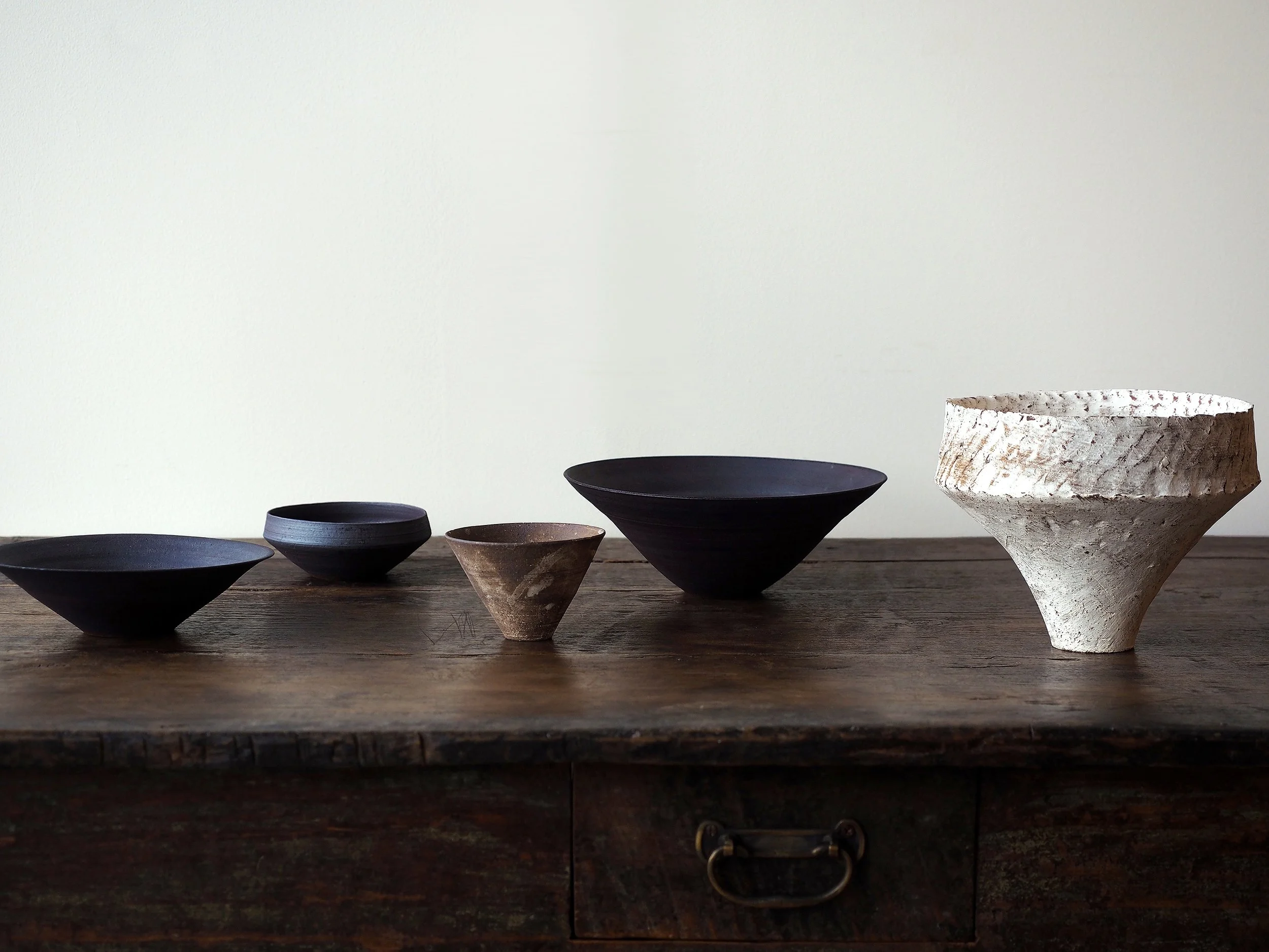 <左から 錆器三角鉢6,050円、錆器ドラ鉢4,400円、やきしめ三角カップ3,960円、錆器リム鉢8,800円、やきしめ花器30,800円>