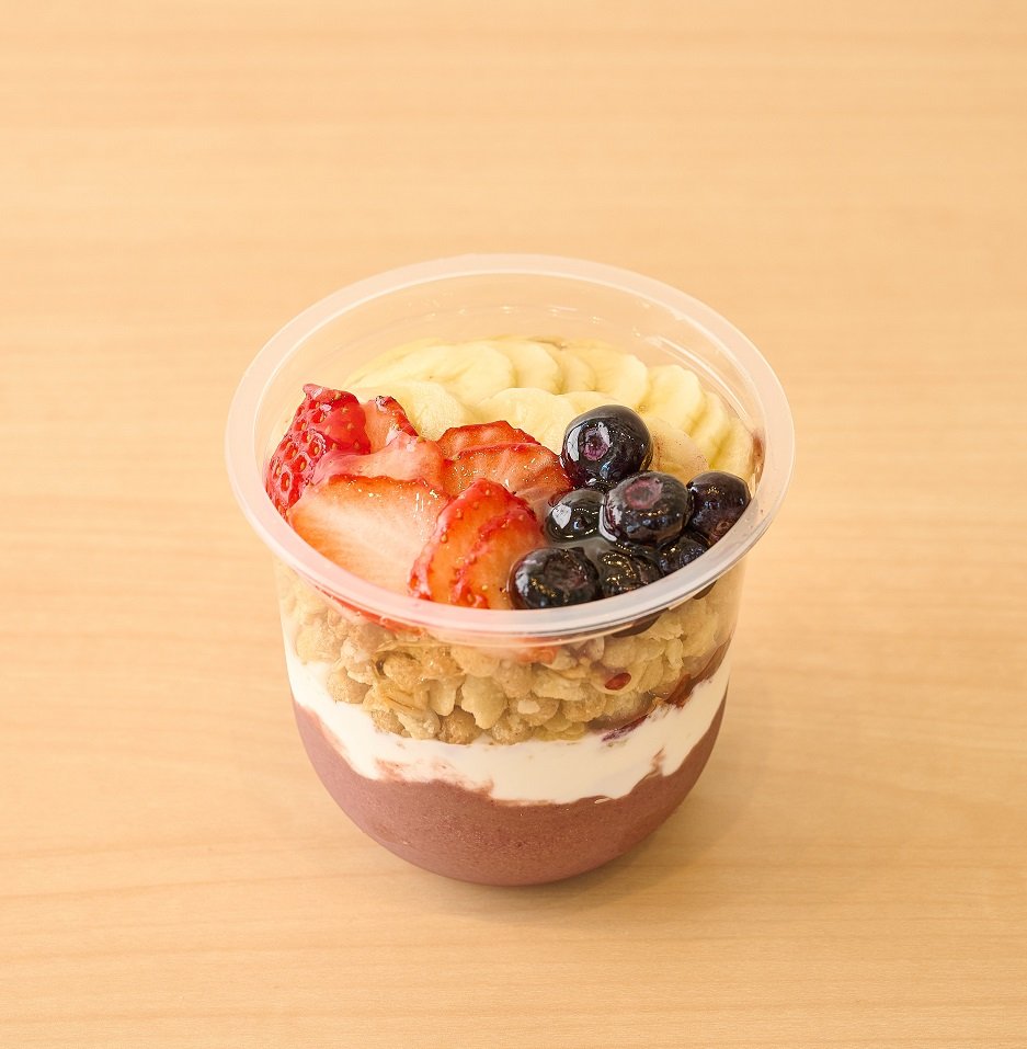 オリジナルブレンドのアサイースムージーの上に、グラノーラ・イチゴ・ブルーベリー・バナナをトッピングした定番のアサイーボウルです。