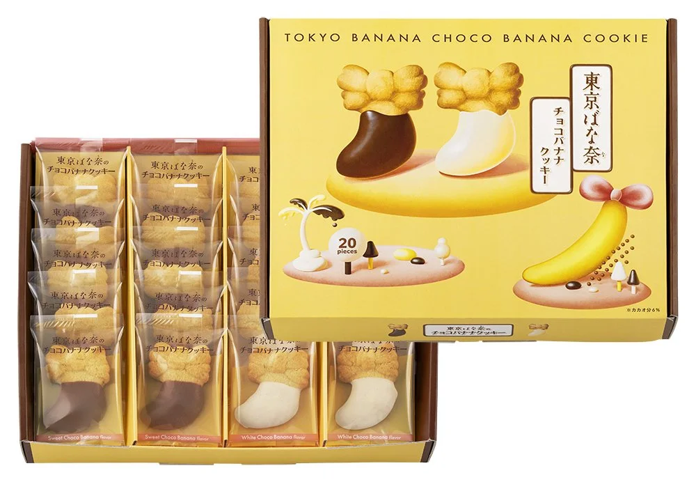 リボンをつけた東京ばな奈デザインのぷっくり分厚いバナナクッキーに、チョコレートのおいしさをとろりとかけました。