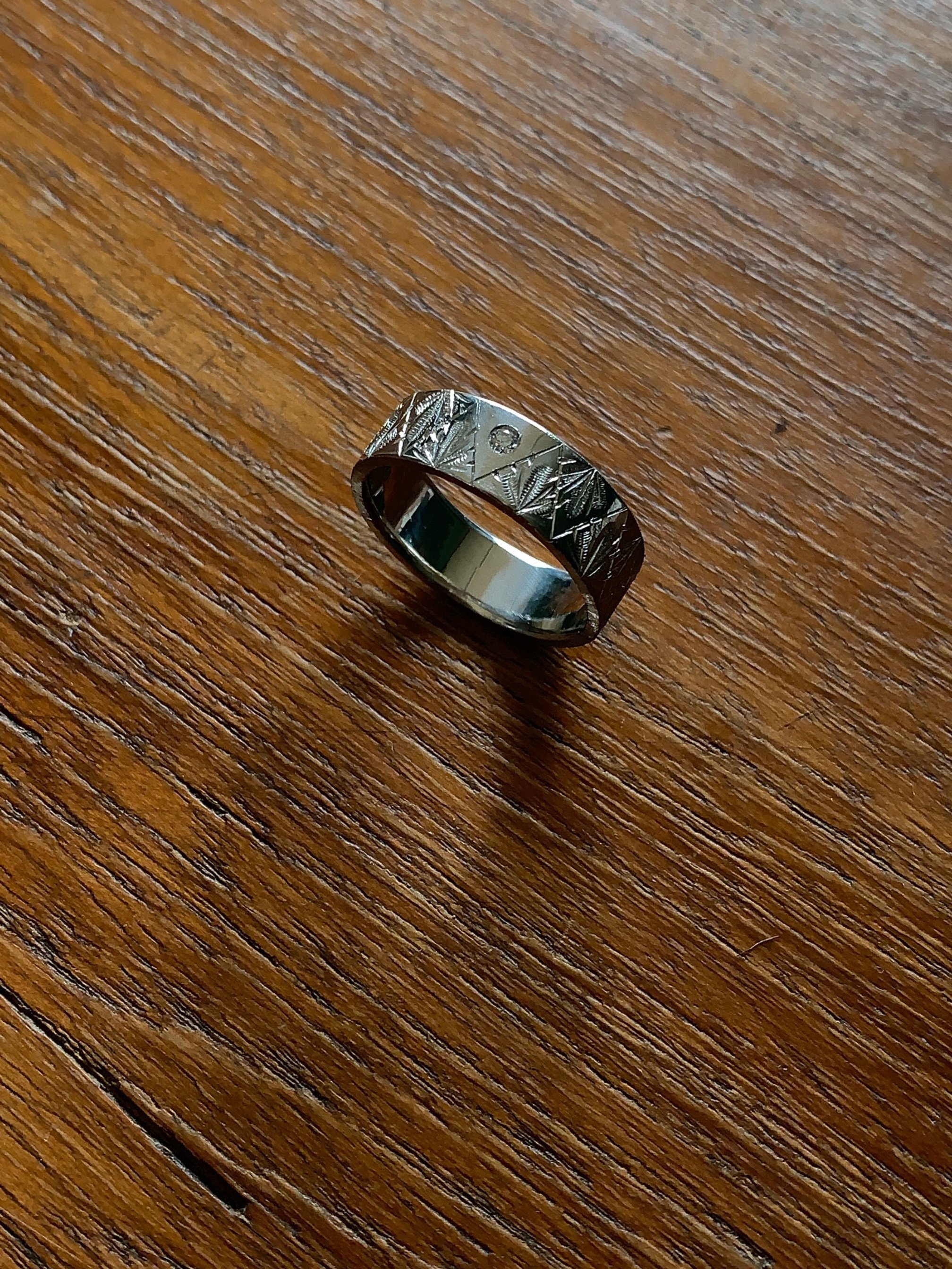 シルバーリングの表面に、植物をモチーフにした模様を洋彫りでほどこしました。一粒のダイヤは聖夜に輝く星をイメージしています。