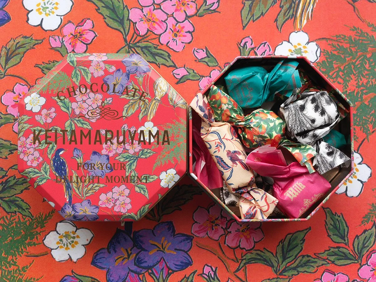 チョコレートはKEITA MARUYAMAのアーカイヴテキスタイル柄やオリジナルデザインなど、味ごとに違う包み紙に包まれ、取り合わせも目に鮮やか。それらが人気の柄である花鳥柄をあしらった八角形の缶に収められ、四角いクッキー缶とはまた違った用途でお楽しみいただけます。