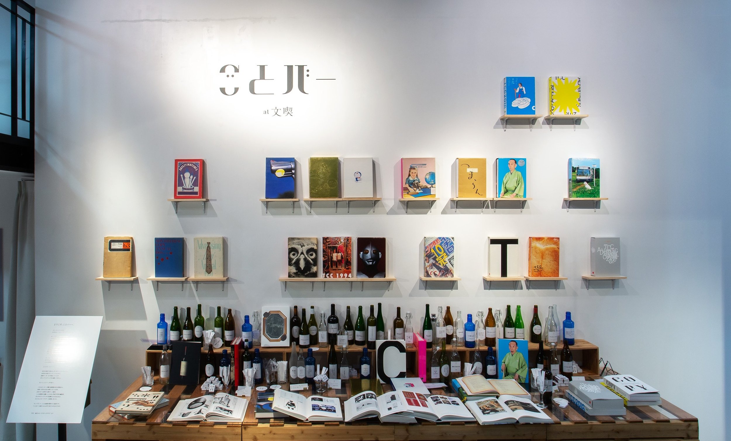 「ことバー」では、1963年の初刊から約60冊におよぶ広告収録本『コピー年鑑』を一堂に展示。実際に手に取ってじっくり読んでいただける貴重な体験を提供するほか、店内はアートディレクター浜辺明弘氏の手によって、様々なコピーに酔える素敵なBAR空間を演出。