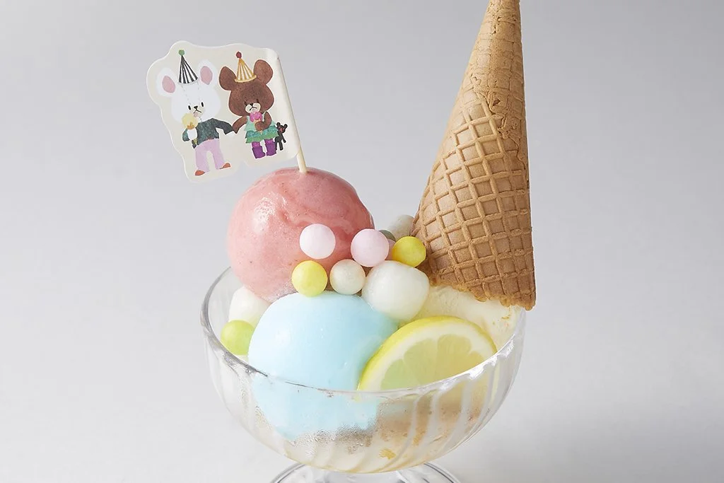 絵本に登場するバースデーケーキをイメージした数量限定のメニュー。ふわっふわなシフォンケーキの上に、もち米を使ったあられ「おいり」をあしらいました。とろりと柔らかなヨーグルトクリームと、いちご、キウイ、バナナ、オレンジ、ブルーベリーなどのフルーツが、爽やかな後味を残します。