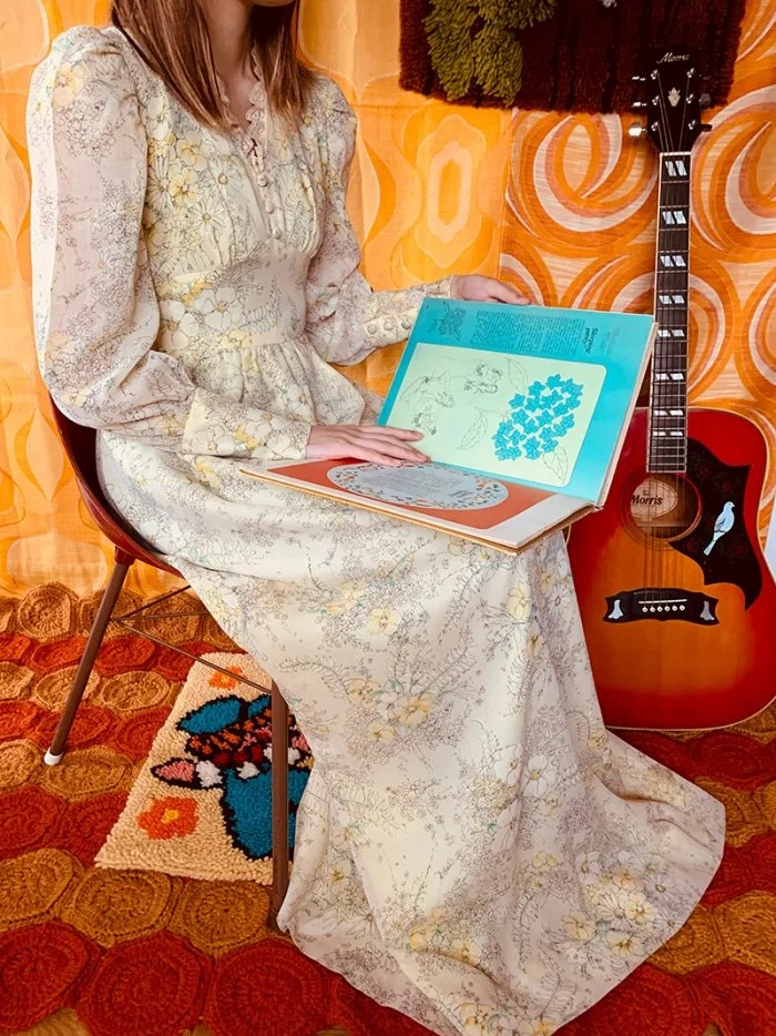 代 ライトイエロー手描き風花柄レースライン ロングドレス