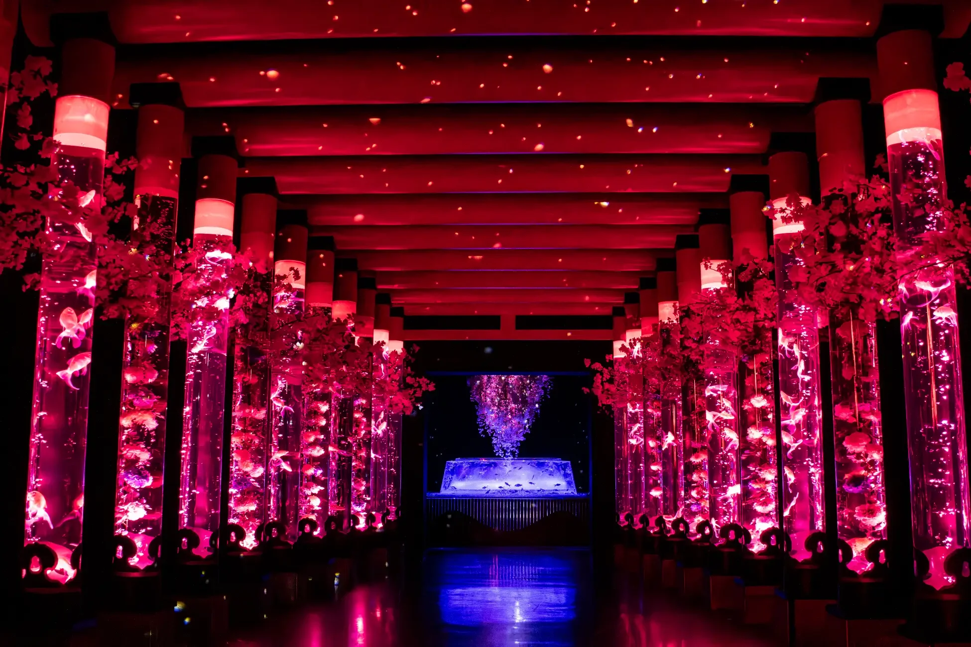 寺社建築に見られる回廊を表現した空間に立ち並ぶ金魚の列柱。
